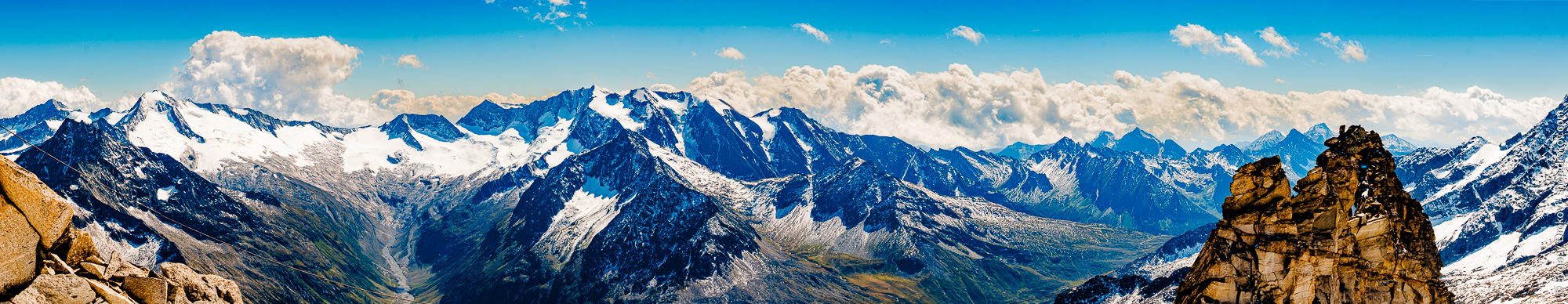 This panoramic vista captures the majestic Hintertuxer Gletscher in Finkenberg, Zillertal, Austria. The dramatic peaks, dusted with snow and set against a vibrant blue sky, showcase the raw beauty of the Alps. This composition highlights the grandeur of the mountain range, inviting viewers to experience its awe-inspiring scale.