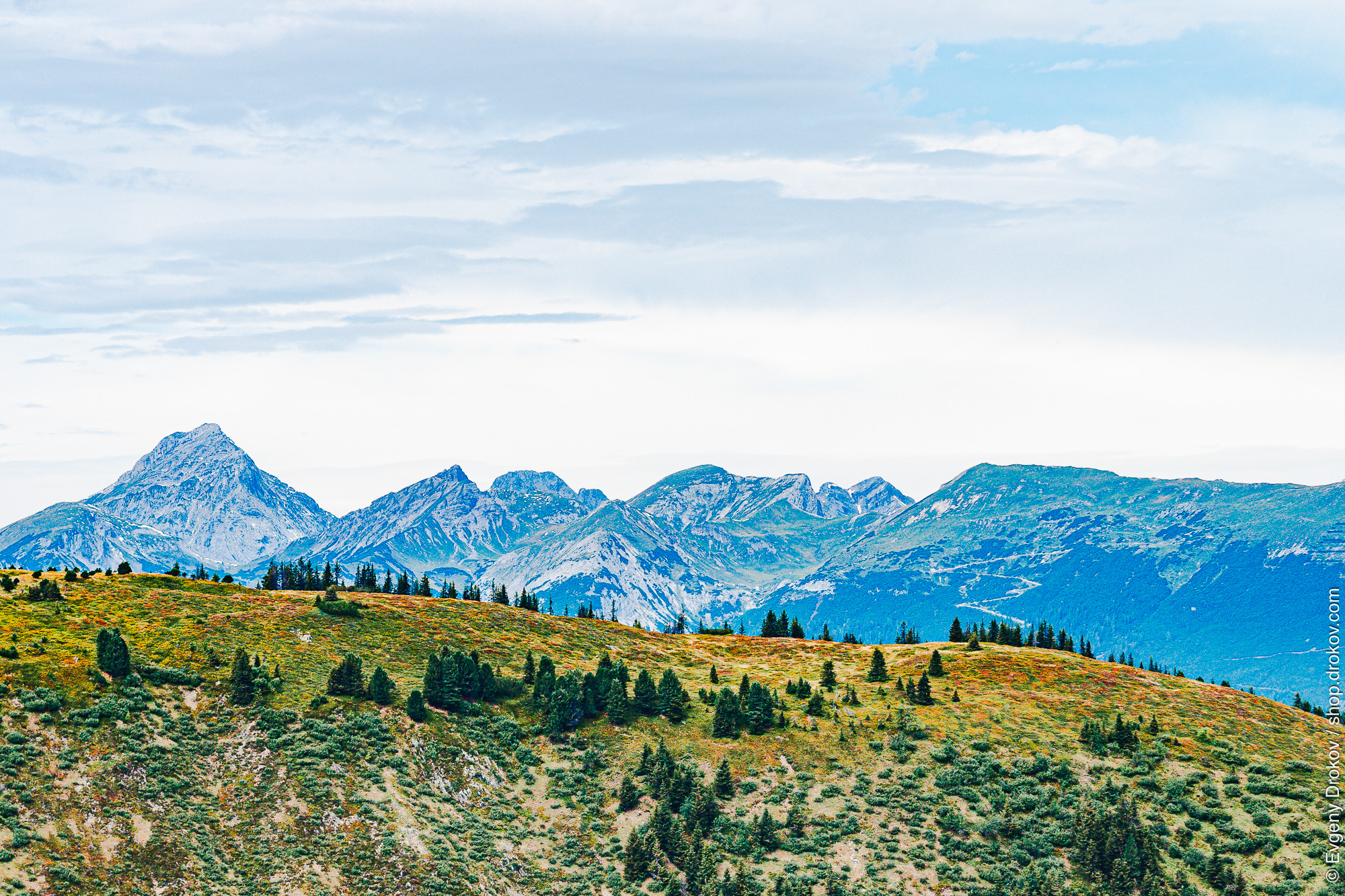 This expansive vista captures the majestic peaks surrounding the Spieljochbahn in Fügen, Zillertal, Austria. The vibrant alpine meadows, dotted with evergreen trees, lead the eye towards the rugged, snow-dusted mountains under a dramatic sky. This composition showcases the breathtaking natural beauty of the region, inviting exploration and appreciation of its grandeur.