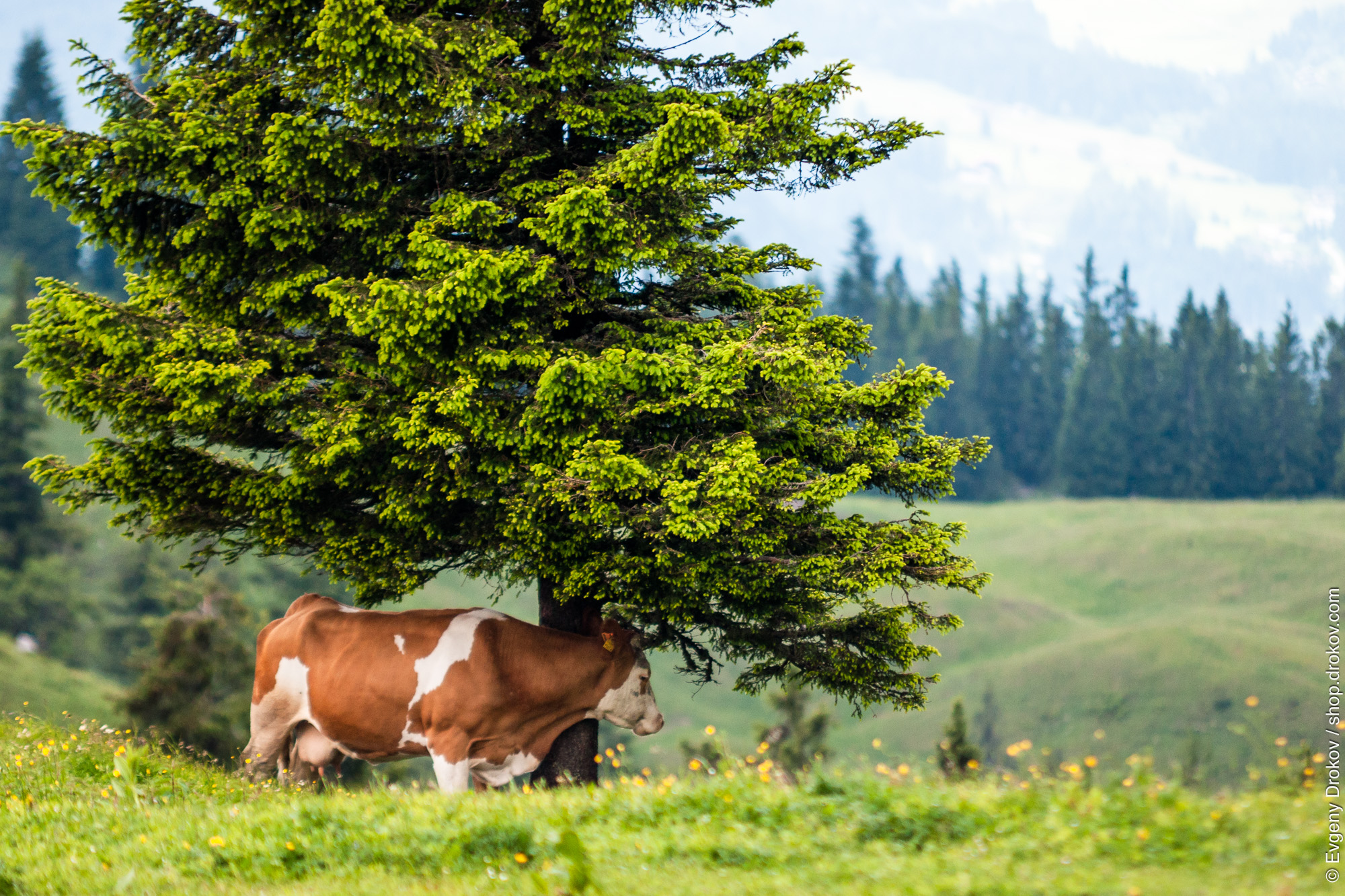 A brown and white cow seeks shade under a lush green fir tree in Gosau, Upper Austria. This tranquil moment captures the essence of alpine pastoral life.