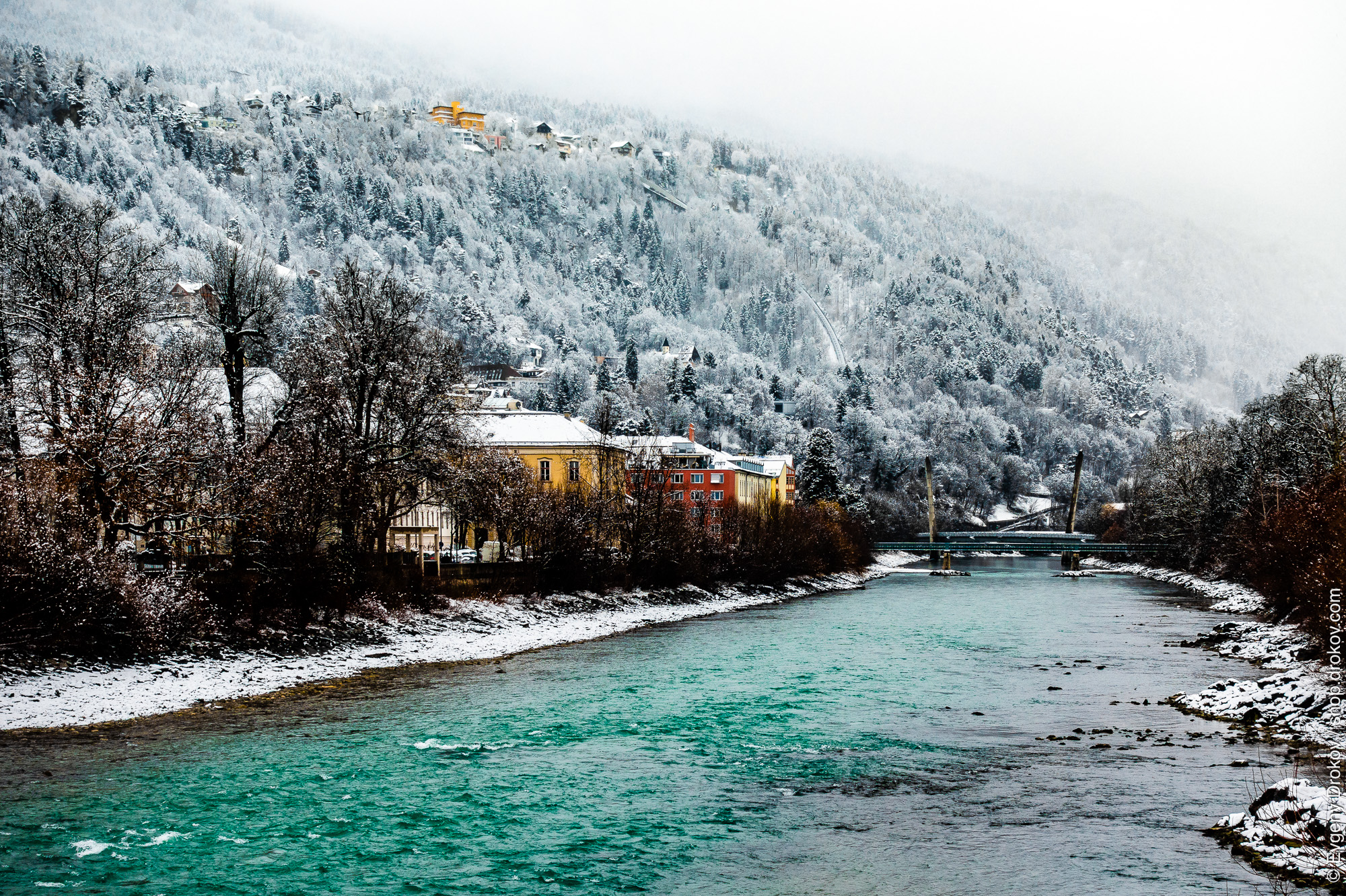 Innsbruck, Austria, presents a serene winter vista. The Inn River flows through a snow-dusted landscape, with buildings nestled against a mist-shrouded, tree-covered mountainside. This captures the tranquil beauty of the city during the colder months.