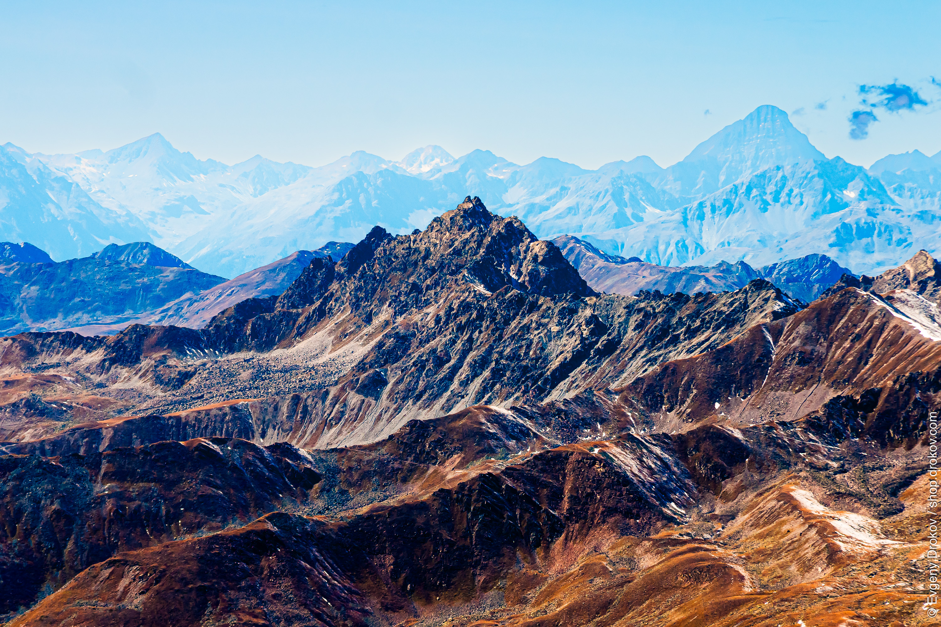 The Karlesjoch, at 3108 meters in Kaunertal, Tyrol, Austria, is captured in this expansive vista. The rugged peaks and layered mountain ranges showcase the dramatic beauty of the Alps, inviting exploration and awe.