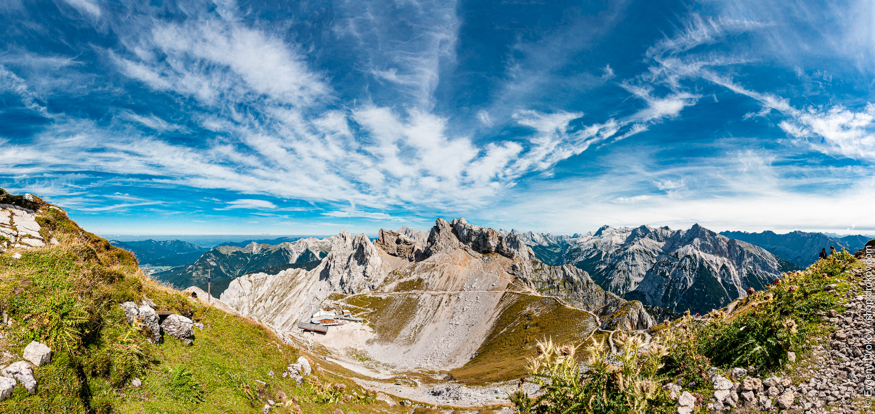 Hikers ascend the Karwendelspitze in Mittenwald, Bavaria, Germany, to experience the breathtaking alpine panorama. This vantage point offers unparalleled views of the rugged mountain range under a vast, cloud-streaked sky.