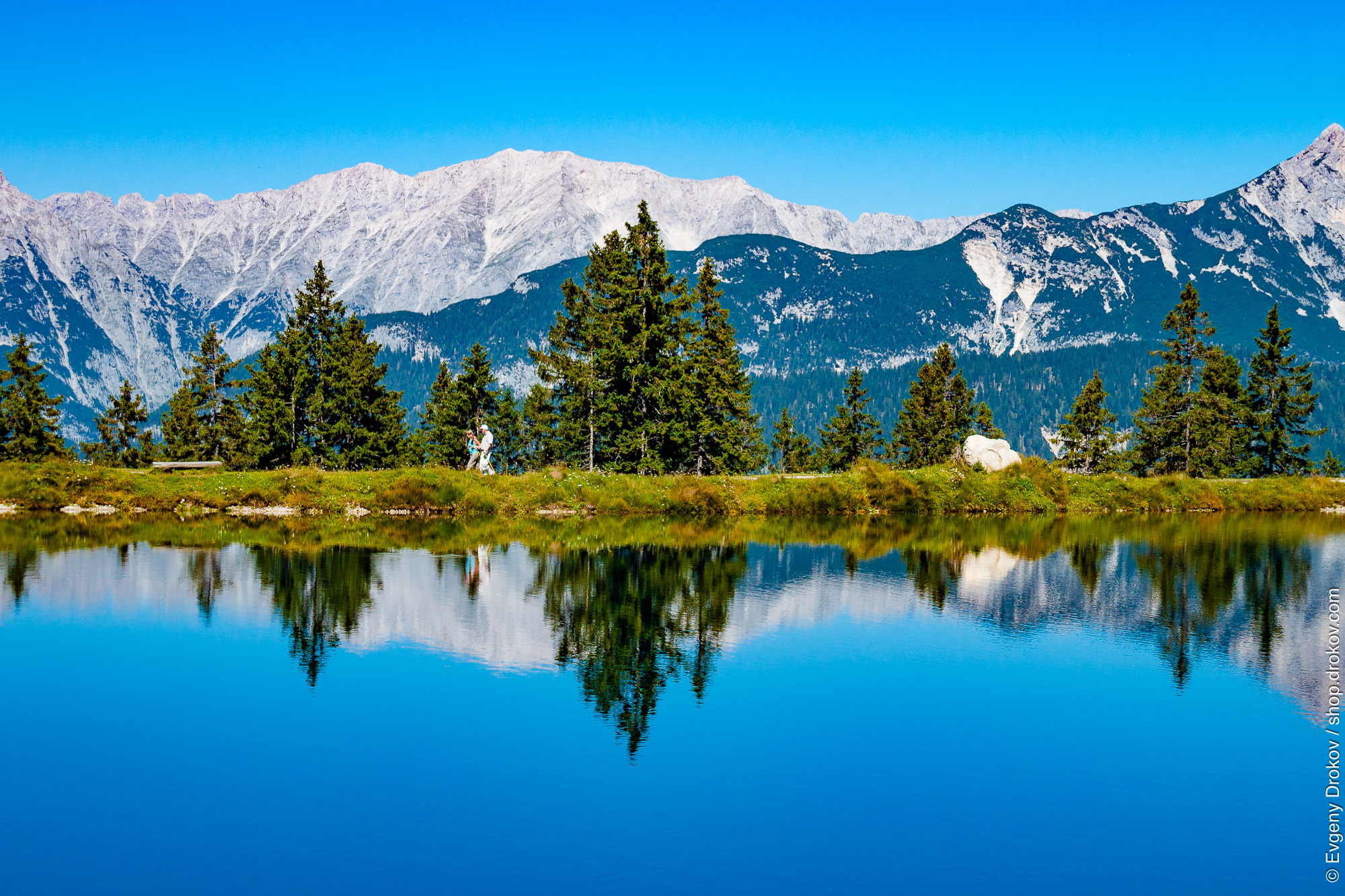 A couple enjoys a leisurely stroll along the serene shores of a mountain lake in Seefeld, Tyrol, Austria. The majestic peaks of the Alps provide a breathtaking backdrop, reflecting perfectly in the still, blue water. This moment captures the essence of a peaceful holiday retreat.