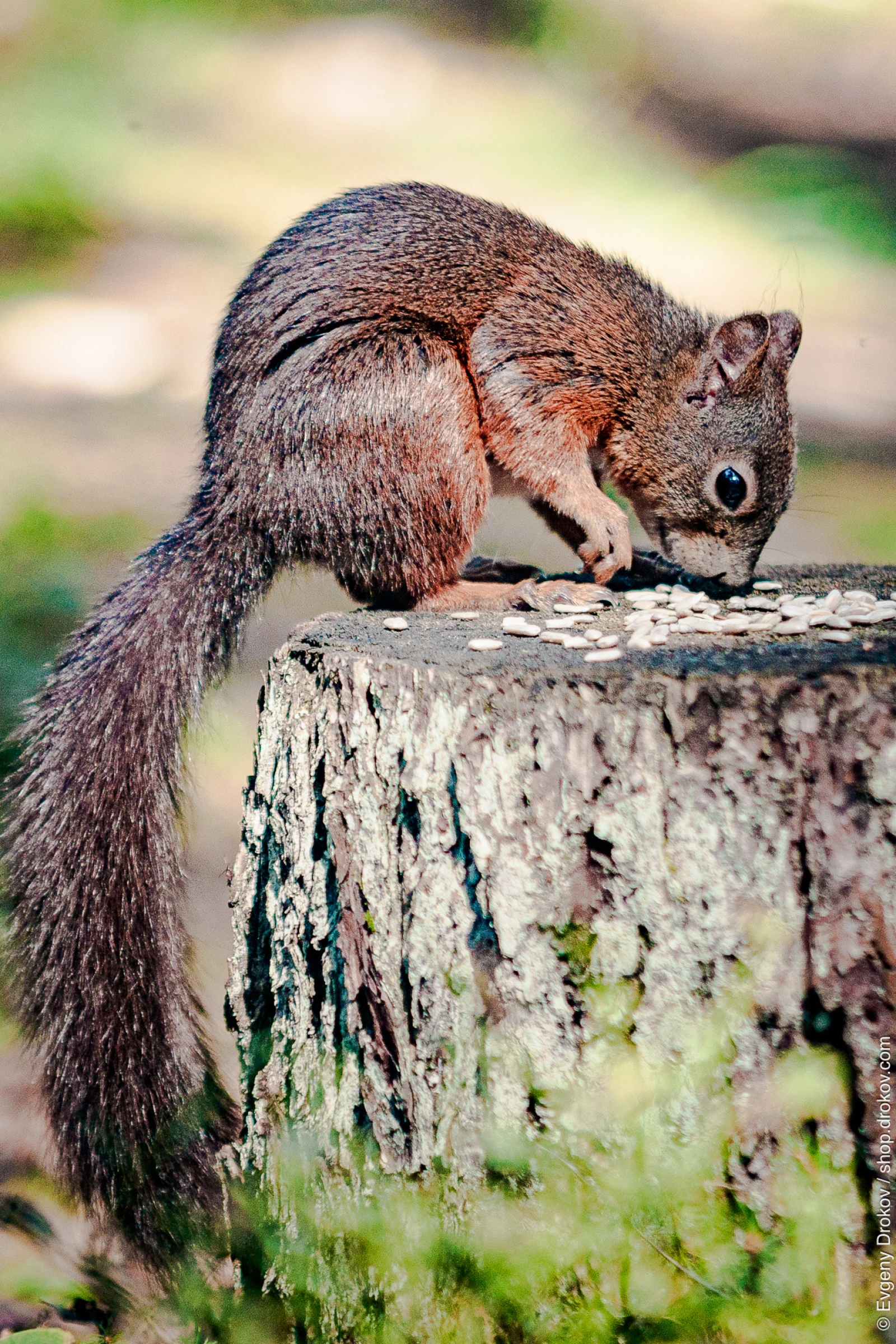 A red squirrel, undeniably, is feasting on sunflower seeds. It's perched atop a tree stump, diligently consuming its meal. The squirrel's focus is entirely on the seeds.