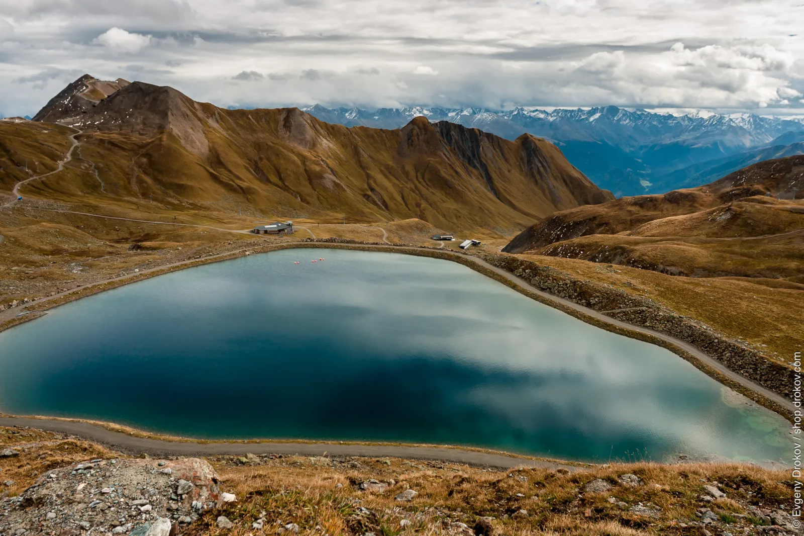 The Hexensee, a reservoir at 2585m in Landeck, Tyrol, Austria, is captured in this expansive view. The purpose is to showcase the dramatic alpine landscape and the man-made lake, highlighting the stark beauty of the region.