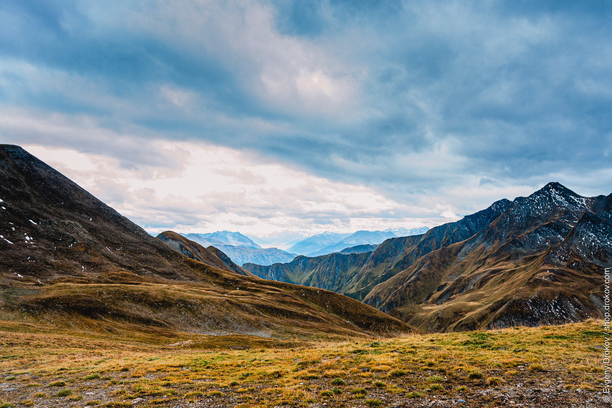 This expansive vista captures the rugged beauty of the Hexensee region in Serfaus, Tyrol, Austria, at an altitude of 2585 meters. The dramatic mountain ranges, bathed in the soft light of a cloudy sky, showcase the raw, untamed nature of the Alps. This view inspires awe and a deep connection with the natural world.