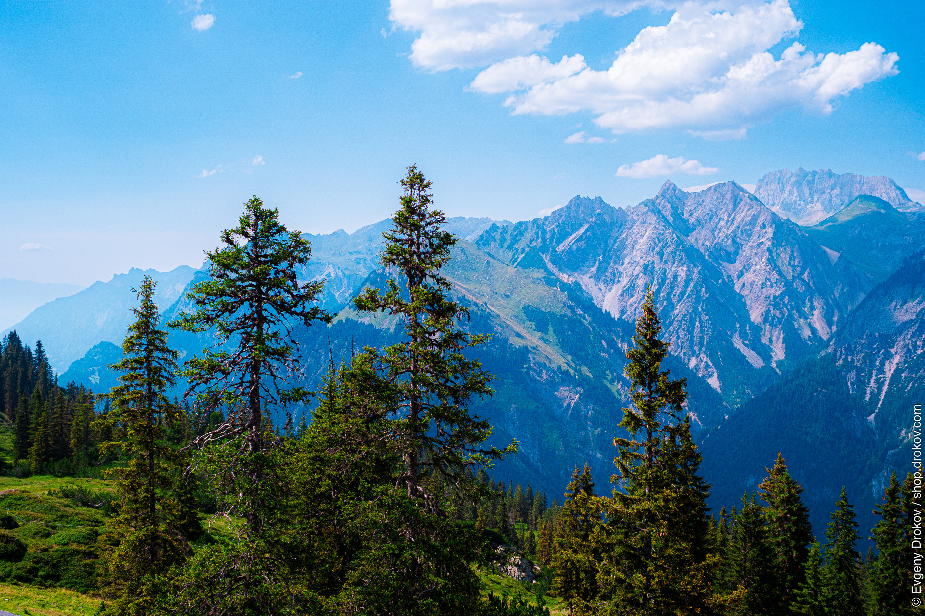 Coniferous trees dominate a mountain valley in Wald am Arlberg, Austria, with majestic, rocky peaks forming a dramatic backdrop under a clear blue sky. This vista captures the raw beauty of the Alps.