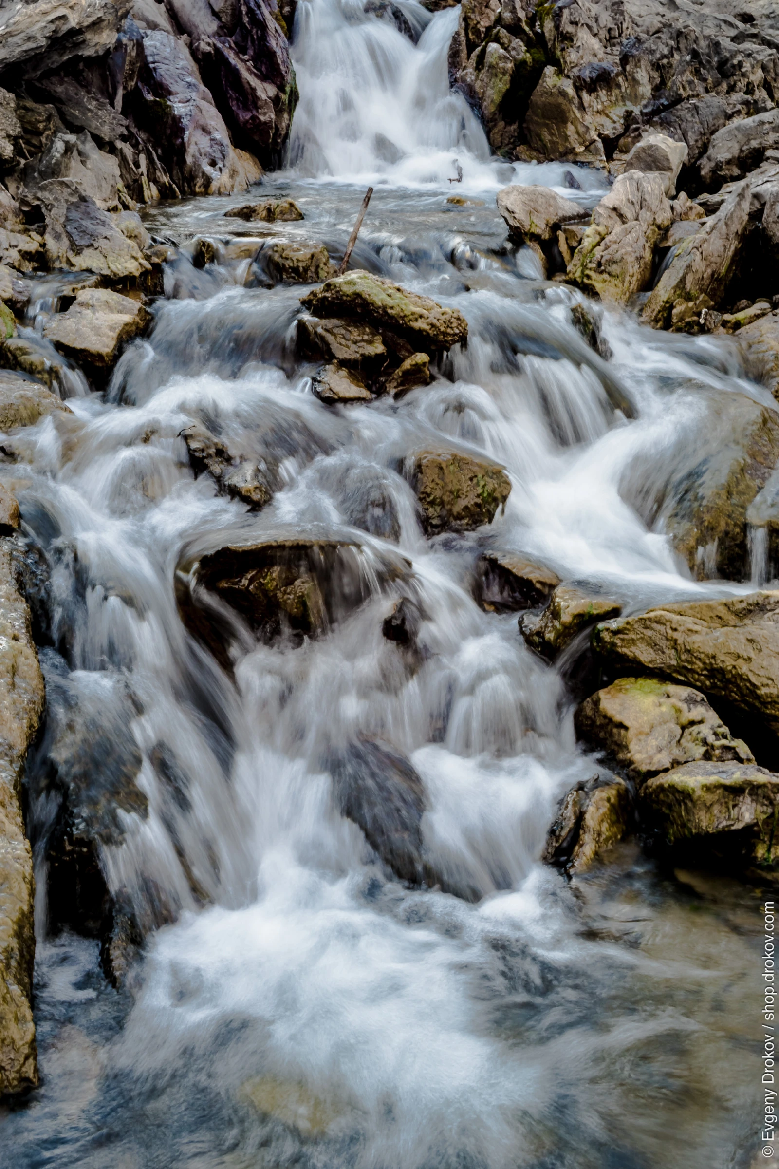 A small waterfall in Lech, Arlberg, Austria, captured with a long exposure to emphasize the dynamic movement of water cascading over rocks. This artistic rendering highlights the raw beauty of nature.