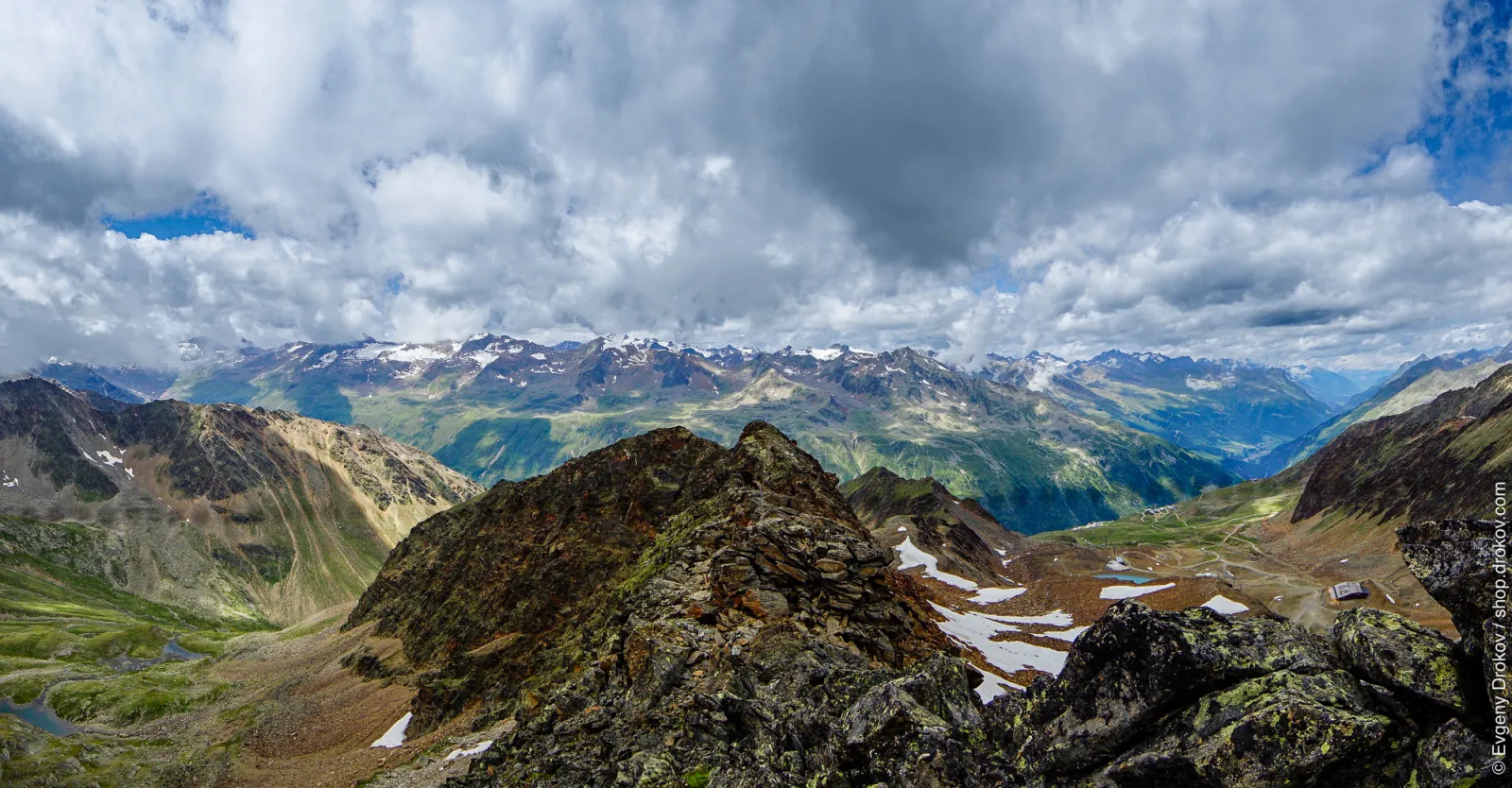 A breathtaking vista of the Alps. This panoramic shot showcases the rugged peaks, valleys, and alpine meadows. The photographer captured the dramatic interplay of light and shadow across the mountain range, highlighting the beauty of the natural world.
