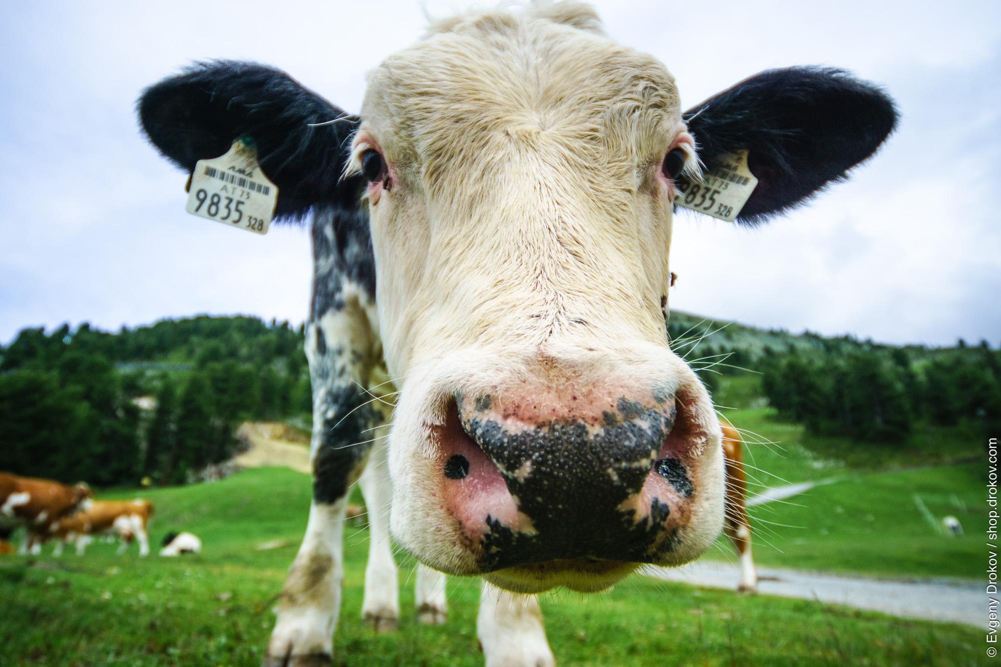 A curious cow, identified by its ear tag, stands in the lush green pastures of Oetz, Tirol, Austria. This close-up perspective captures the essence of the Oetztal Alps' natural beauty, showcasing the region's pastoral charm.