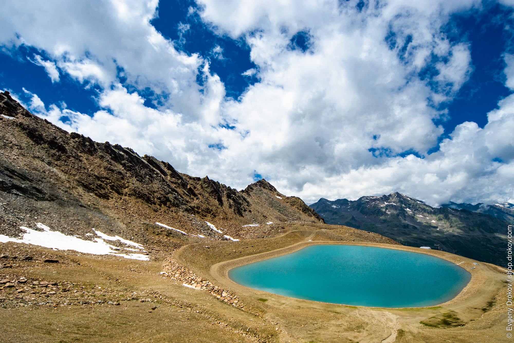 This striking vista captures the raw beauty of the Oetztal Alps in Gurgl, Tirol, Austria. The vibrant turquoise of the alpine lake contrasts with the rugged, rocky slopes and dramatic clouds, showcasing the untamed nature of this breathtaking region.