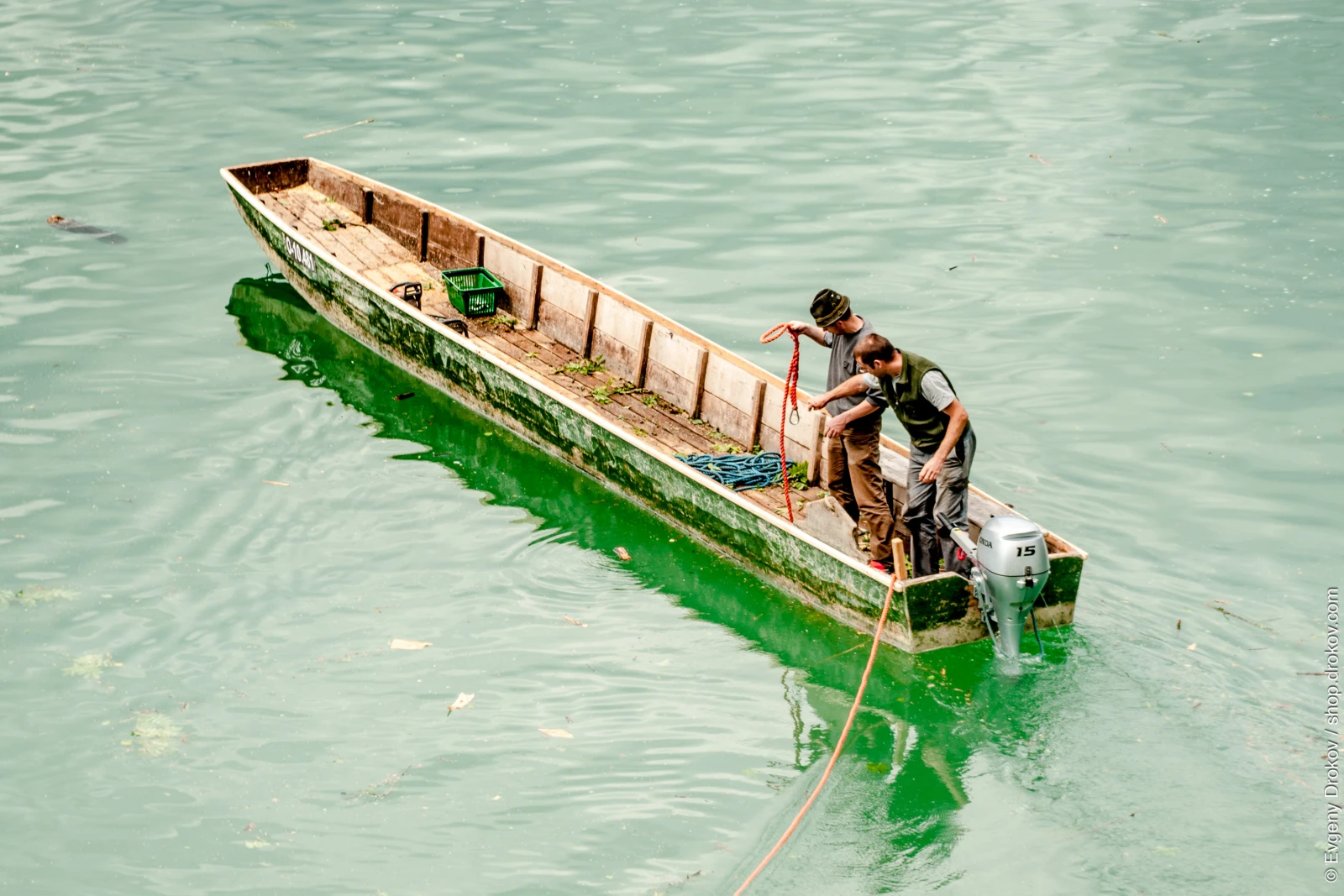 Two men are working on a wooden boat in St. Wolfgang im Salzkammergut, Austria, in June 2013. They are preparing the boat for use on the water, evidenced by the ropes and outboard motor.