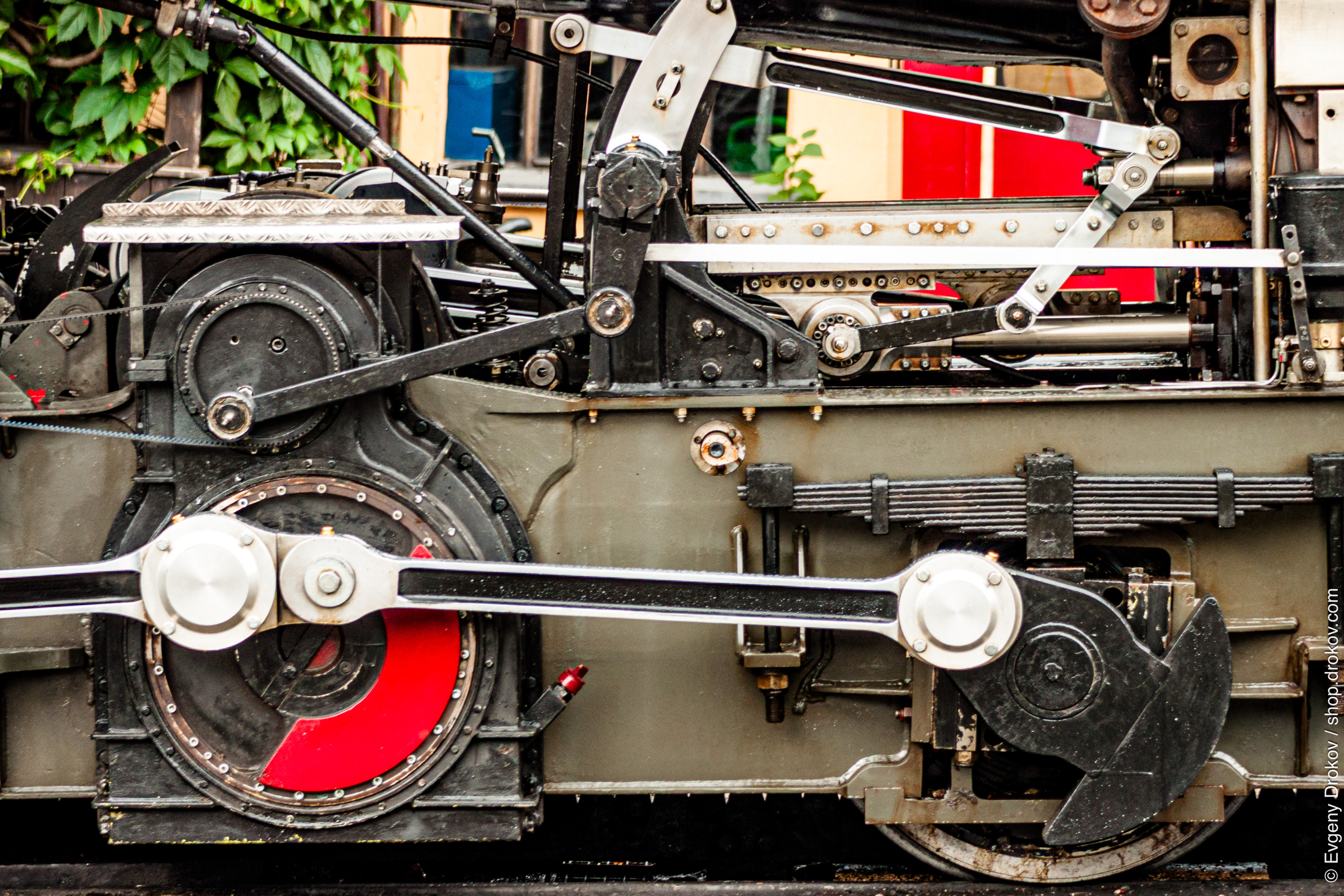 This is a close-up of the intricate machinery of a steam locomotive, captured in St. Wolfgang im Salzkammergut, Austria, in July 2013. The detailed view highlights the complex engineering and robust construction of the train's drive system, showcasing its power and historical significance.