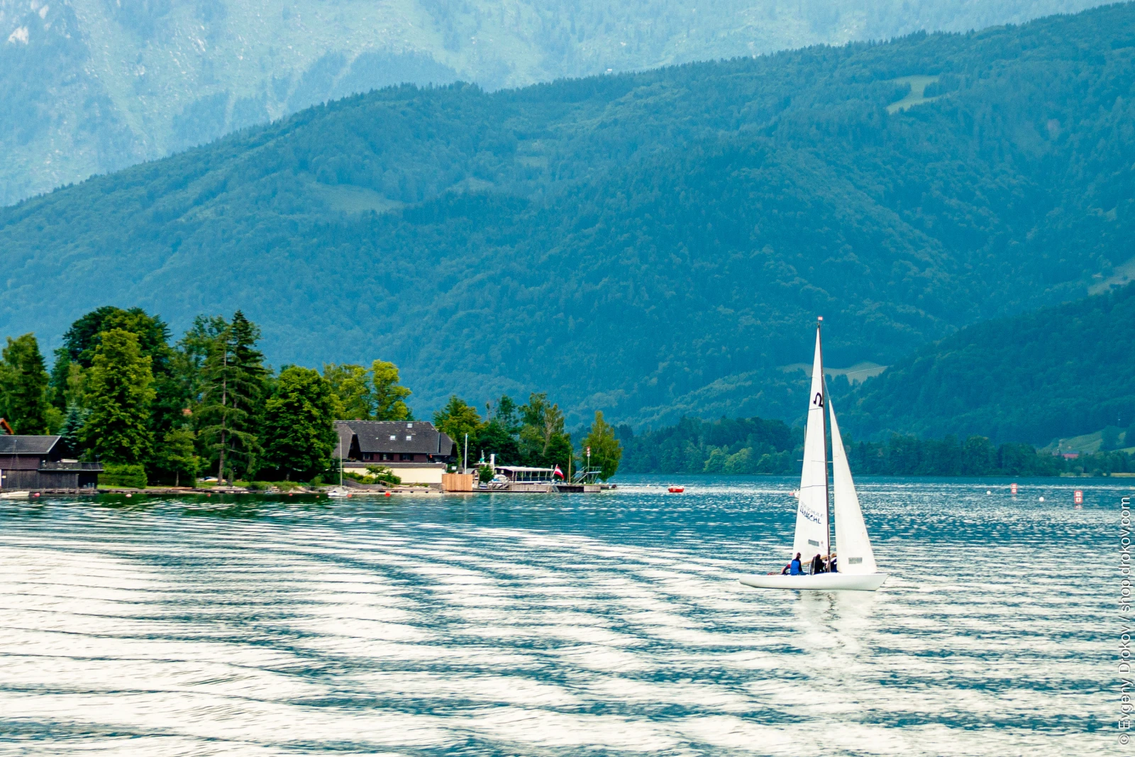 A sailboat gracefully navigates the serene lake, surrounded by lush mountain scenery. The tranquil waters reflect the surrounding beauty. This photo perfectly captures the peaceful atmosphere of a lakeside sailing experience.