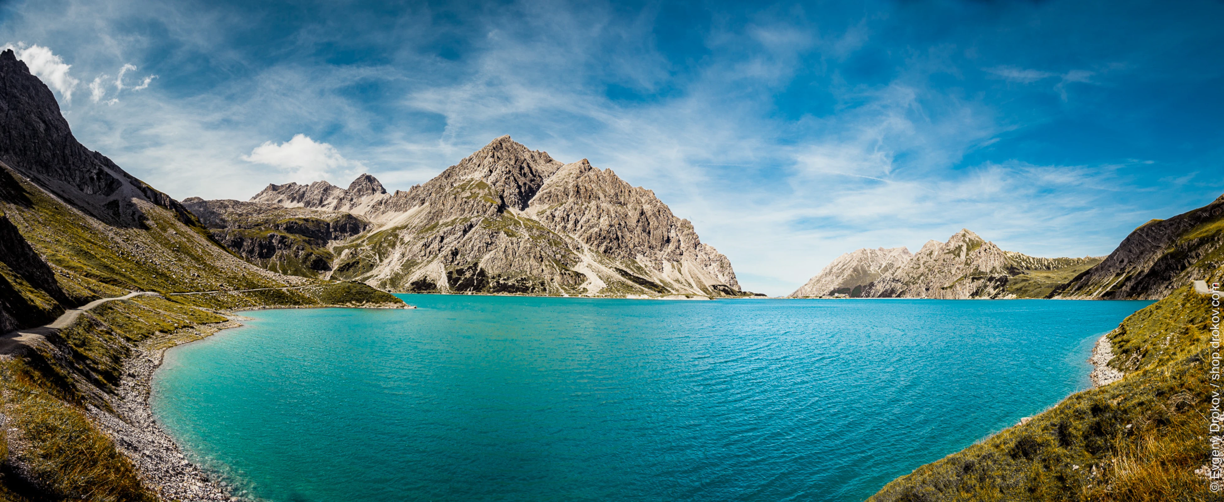 The Lünersee in Vandans, Vorarlberg, Austria, showcases its stunning turquoise waters against rugged mountain peaks. This panoramic vista captures the raw beauty of the Alps, inviting exploration and awe.