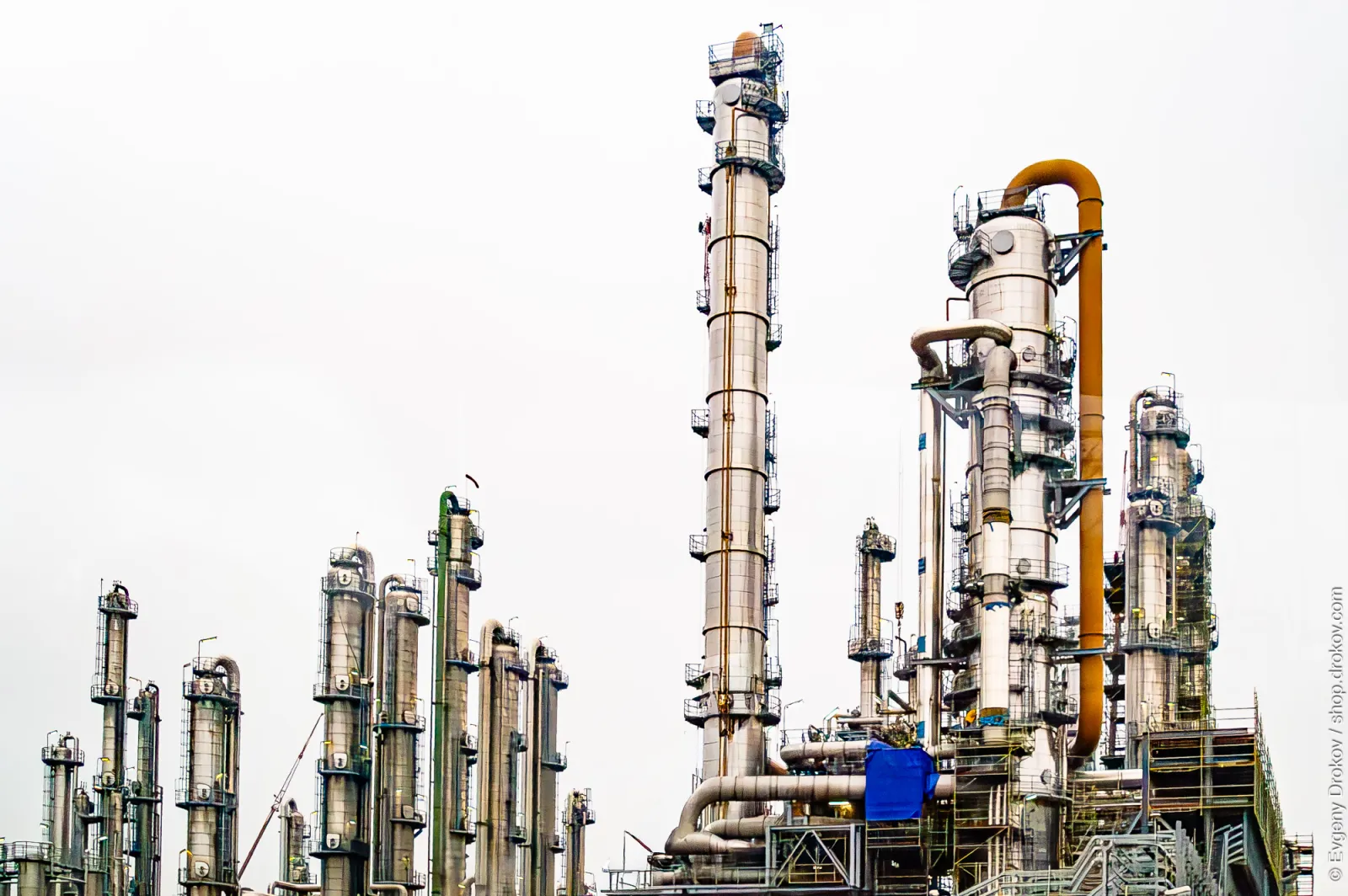 Towering distillation columns dominate the industrial landscape of the Port of Antwerp, Belgium. This complex network of pipes and structures signifies the critical processes of refining and chemical production that drive global commerce.