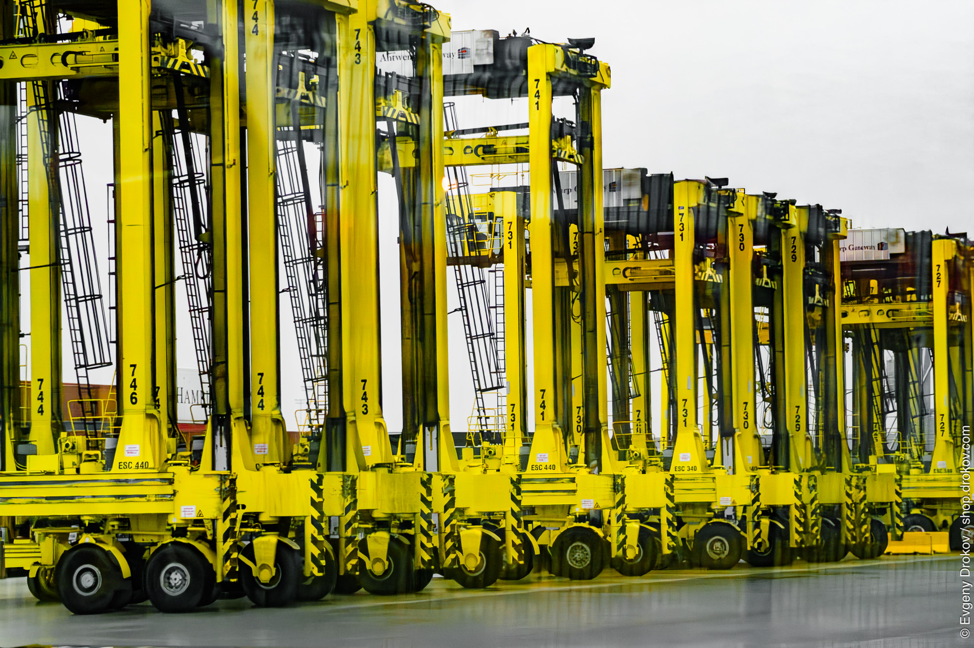 A line of yellow straddle carriers, identified by their markings like "ESC 440" and numbers such as "744" and "743," are positioned at the Port of Antwerp, Belgium. These machines are essential for the efficient movement and stacking of shipping containers, facilitating global trade and logistics.