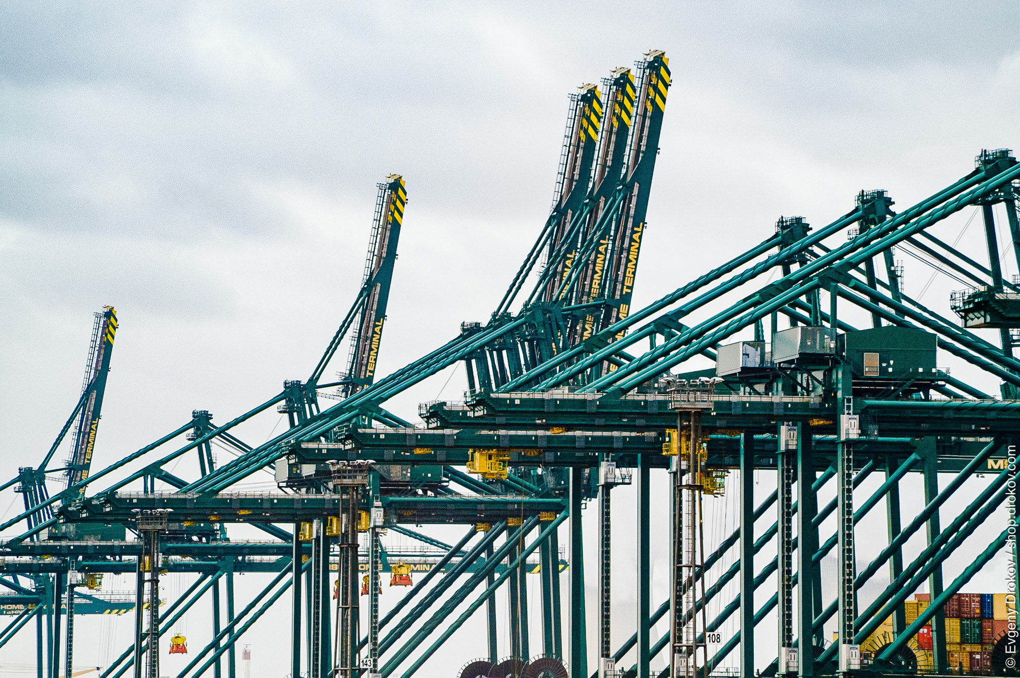 Massive port cranes at the Antwerp, Belgium terminal are actively lifting and moving cargo containers. This essential industrial operation drives global trade and commerce.