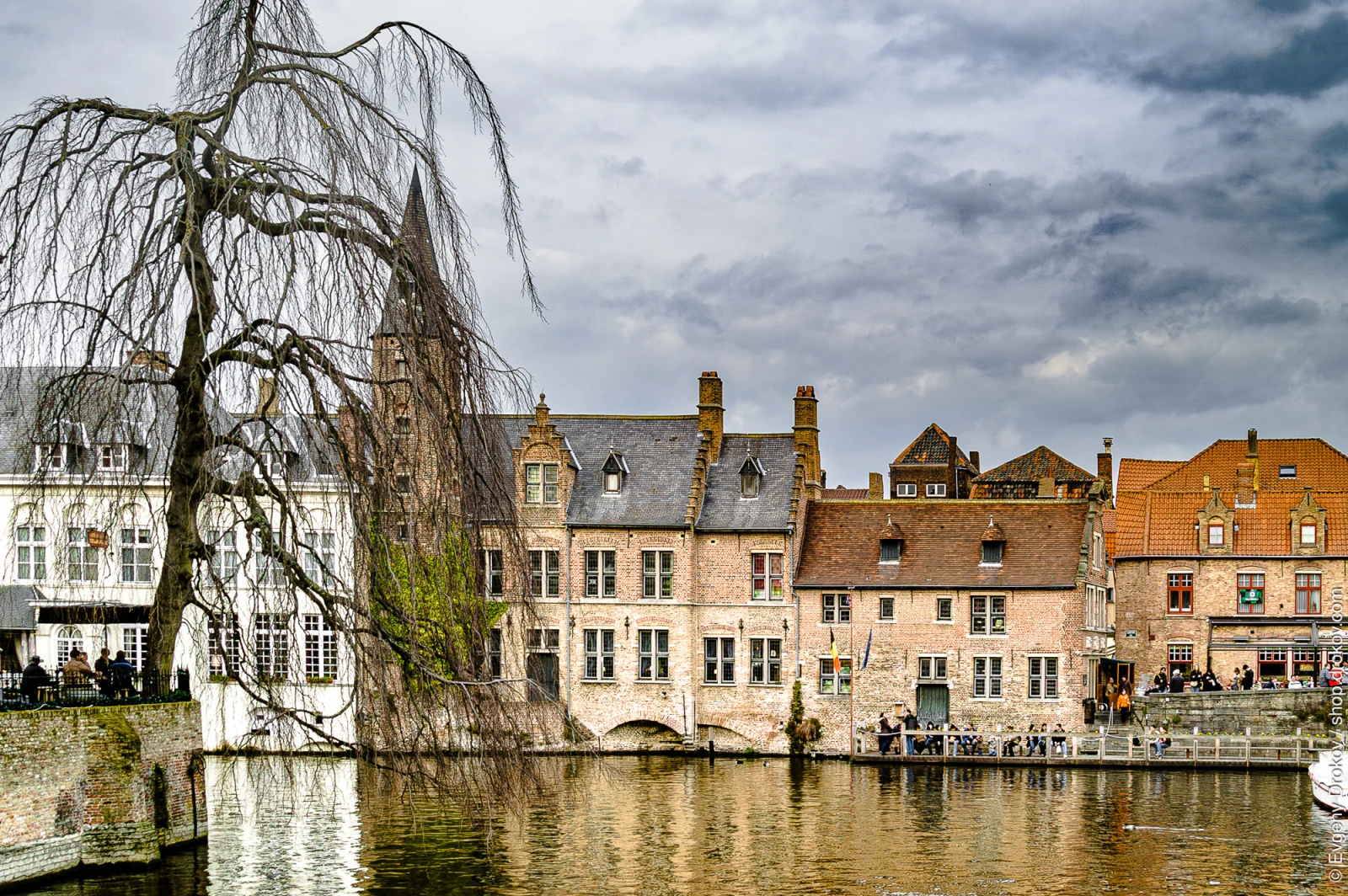 A picturesque canal scene in Bruges, Belgium. Historic brick buildings line the waterway, reflecting in the calm water. People relax on a riverside walkway, enjoying the ambiance. This photo perfectly captures the charm of a European city.