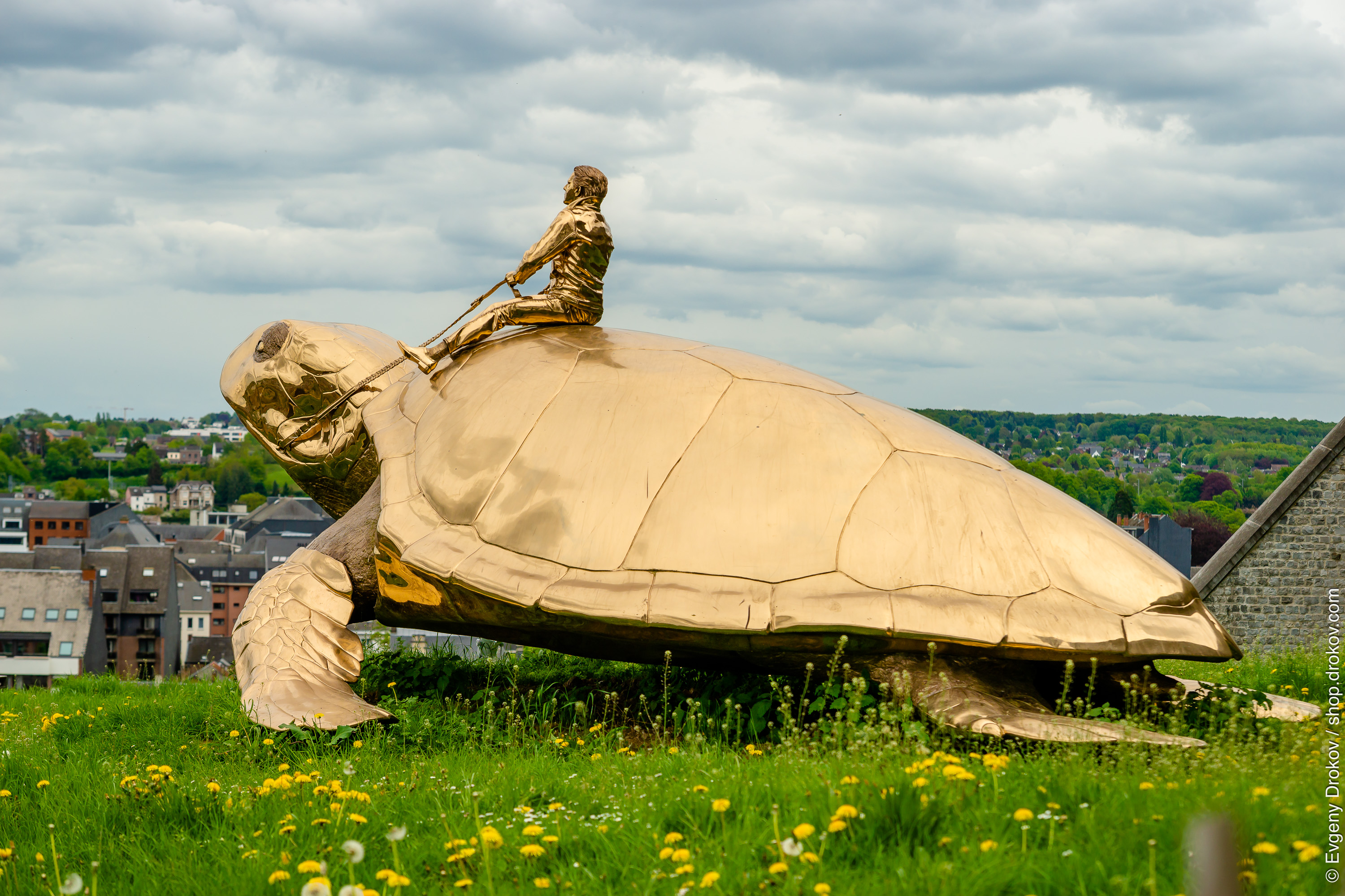 A striking golden sculpture of a person riding a giant turtle commands attention in Namur, Wallonia, Belgium. This artwork serves as a powerful visual metaphor for life's deliberate journey and the concept of slow, steady progress.