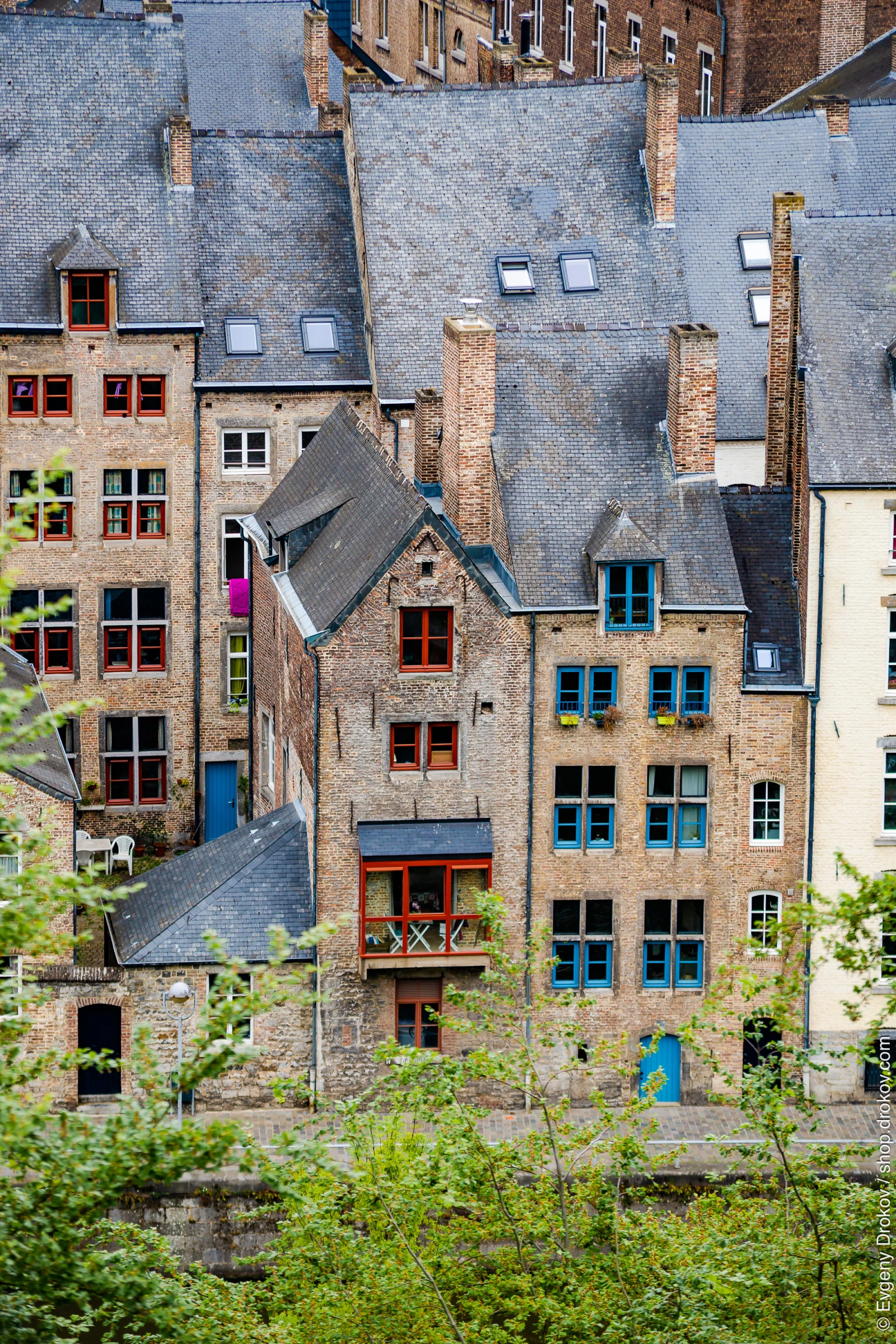 This is a high-angle perspective of historic brick buildings in Namur, Wallonia, Belgium. The architecture showcases traditional European design with slate roofs and prominent blue doors and windows, highlighting the city's charm.