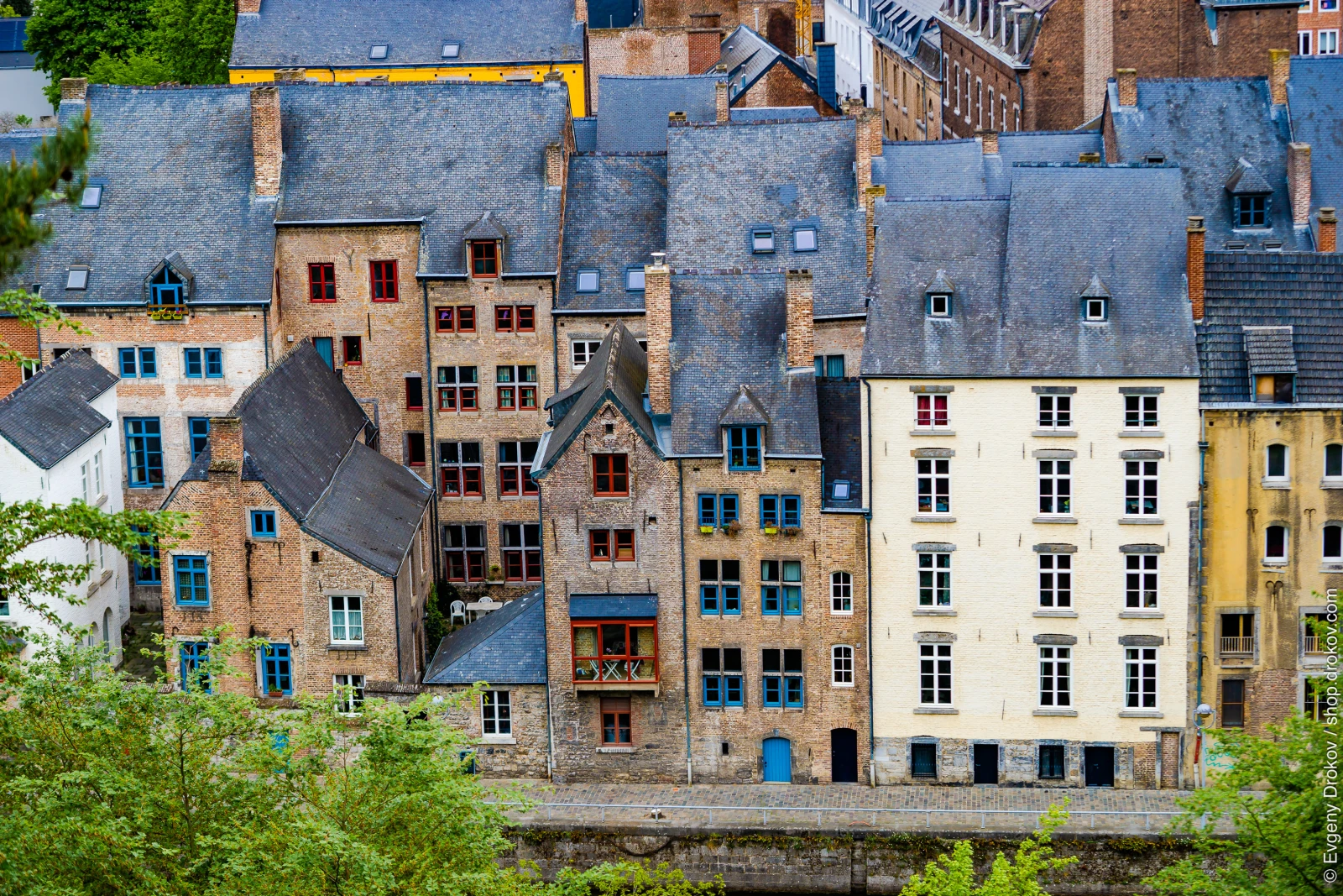 An aerial perspective reveals the dense urban fabric of Namur, Wallonia, Belgium. Historic brick and stone buildings with slate roofs and distinctive blue-framed windows showcase the city's architectural heritage. This view captures the charm and character of this European locale.