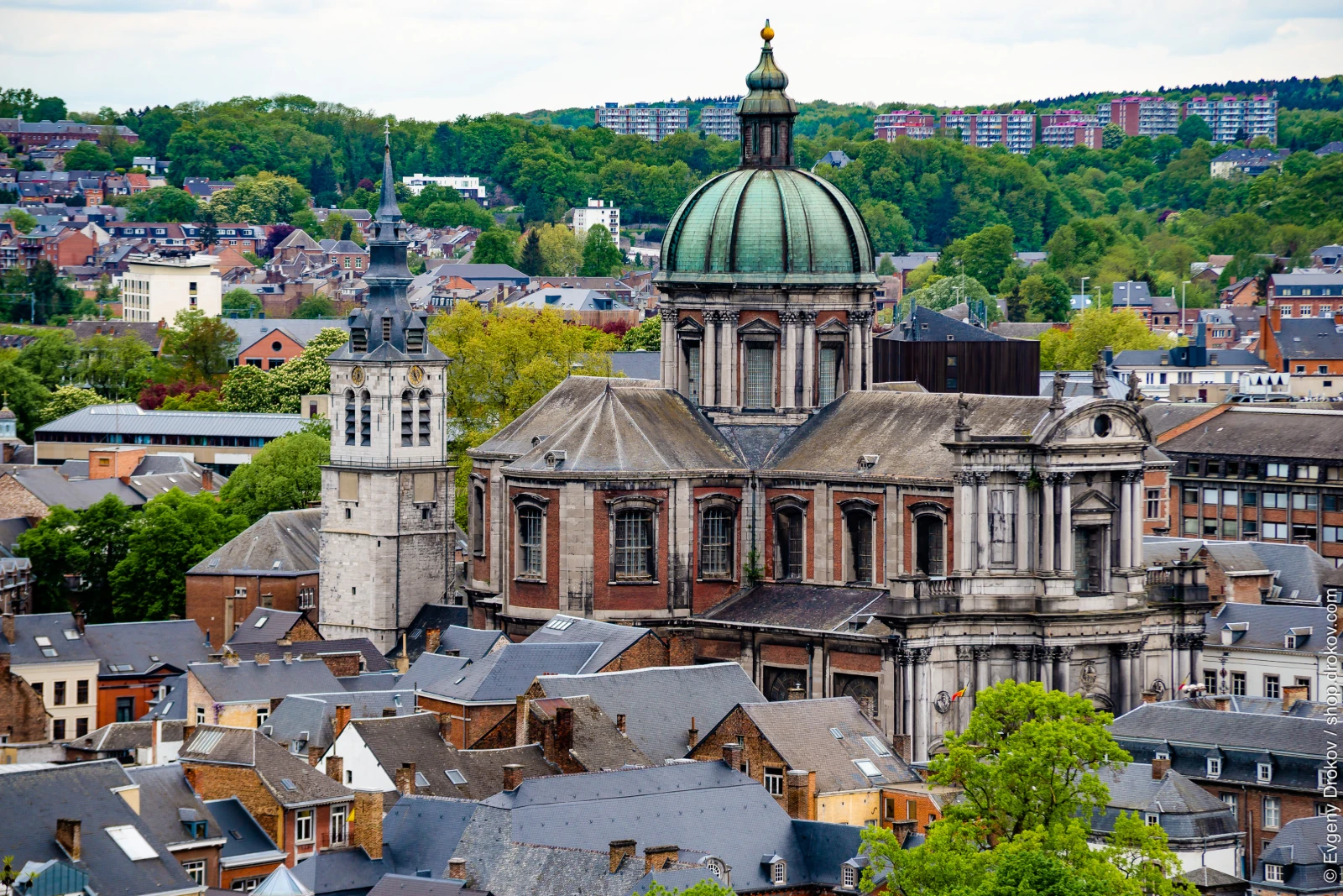 A high-angle perspective captures the heart of Namur, Belgium, showcasing its iconic cathedral with a striking green dome. This view highlights the city's architectural tapestry, blending historical structures with modern buildings, all nestled amidst lush greenery.