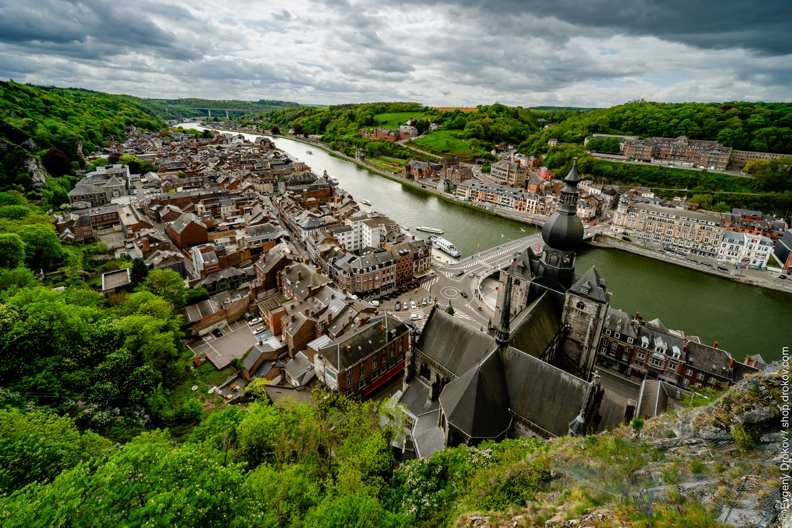 This high-angle perspective captures the historic town of Dinant, Belgium, nestled along the Meuse River. The architectural grandeur of the Collegiate Church of Notre-Dame stands prominently, showcasing the town's rich heritage. The surrounding lush green hills provide a dramatic backdrop, emphasizing the unique topography of this Wallonian gem.
