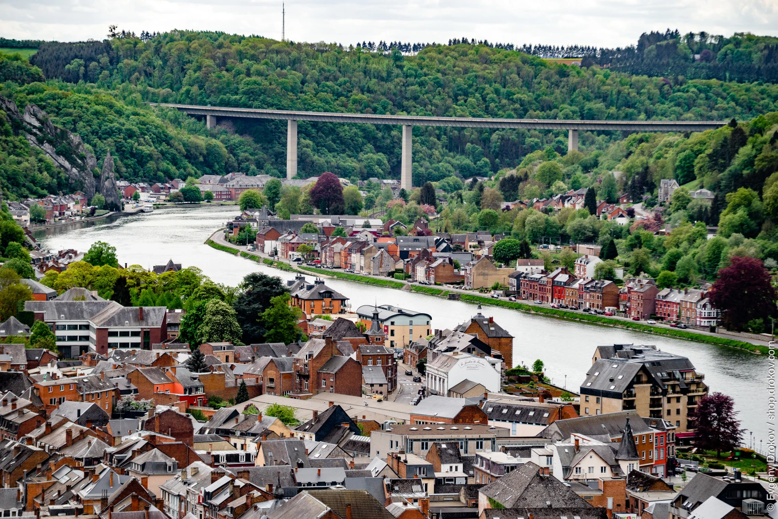 This high-angle perspective captures the picturesque European town of Dinant, Wallonia, Belgium. The view showcases the town's charming architecture nestled within a valley, bisected by a river and spanned by a modern highway bridge, highlighting the blend of history and infrastructure.