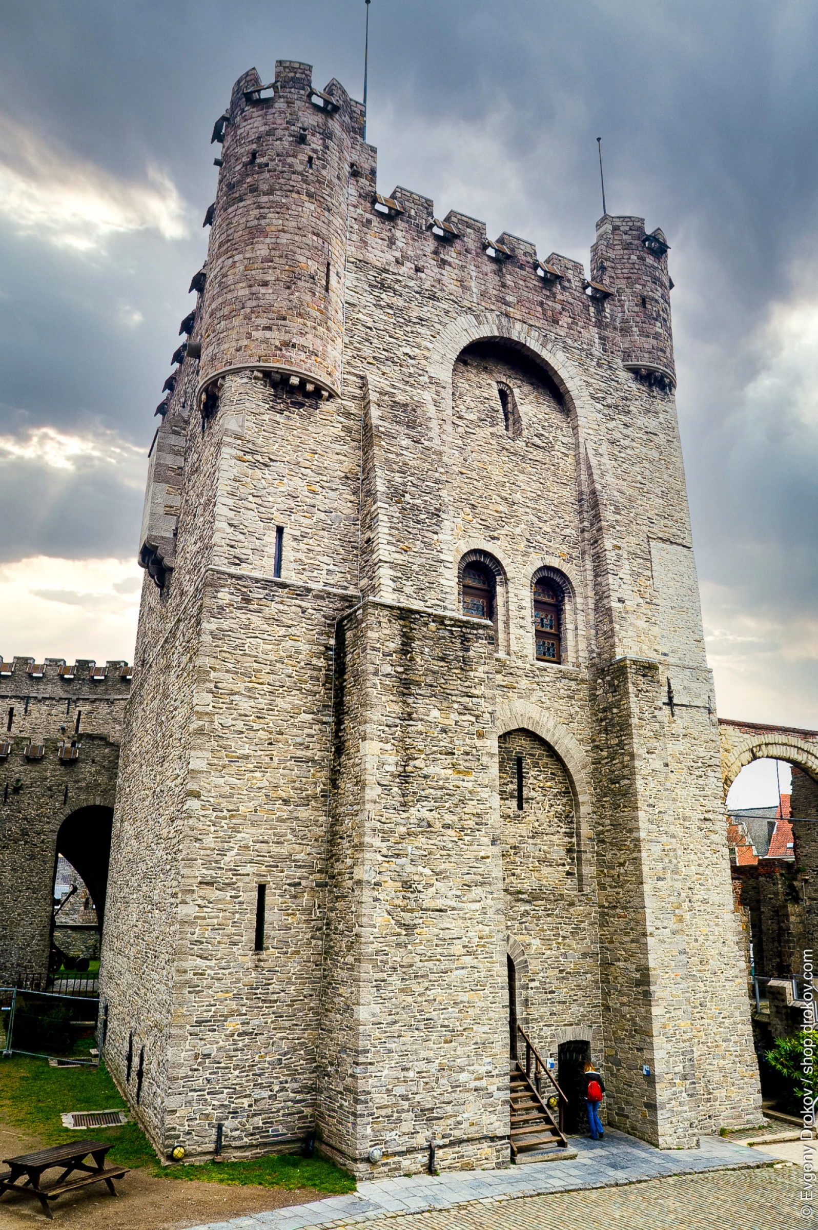 A lone visitor enters the Gravensteen castle in Ghent, Belgium. This imposing medieval fortress stands as a testament to the city's rich history, inviting exploration and discovery.