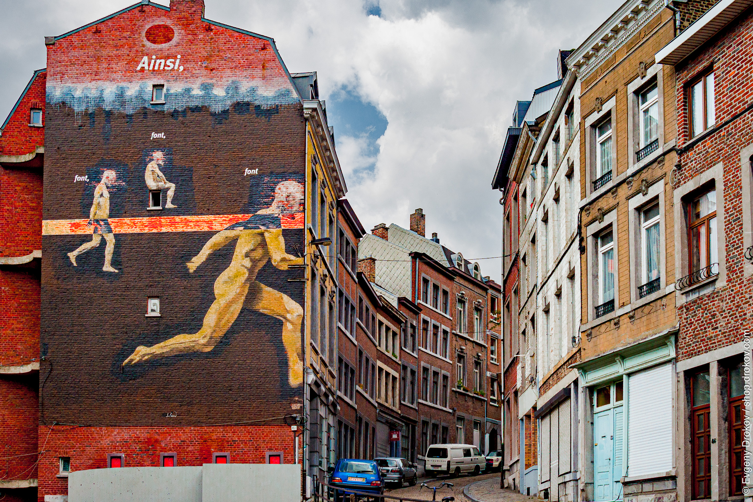 A striking mural adorns a building in Liege, Belgium, depicting figures in motion. The artwork transforms the urban landscape, adding a dynamic visual element to the street.