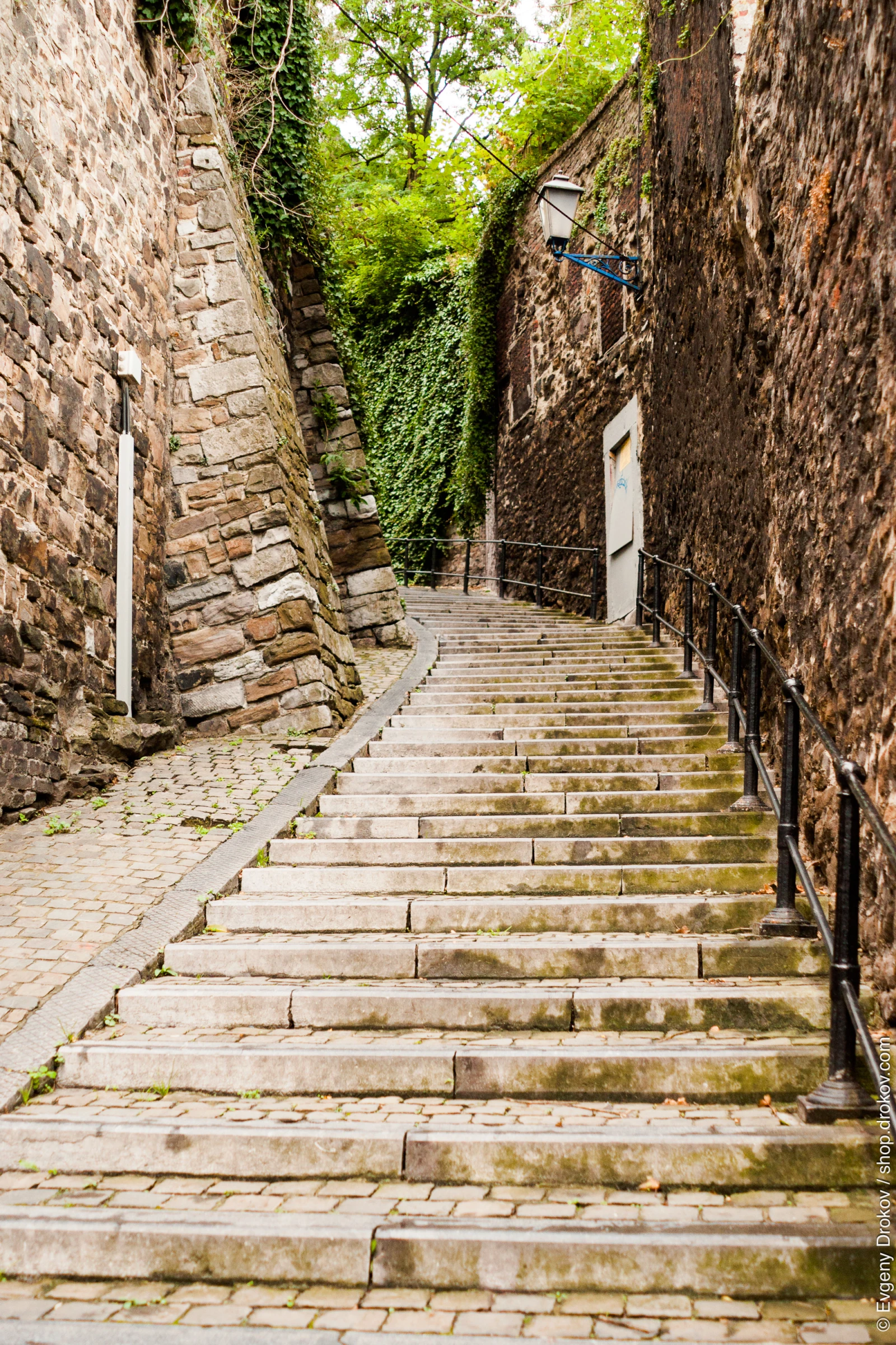 A stone staircase ascends through a narrow alley in Liege, Belgium. The weathered walls, draped in ivy, and the worn steps evoke a sense of history and timelessness, inviting exploration of the city's hidden corners.