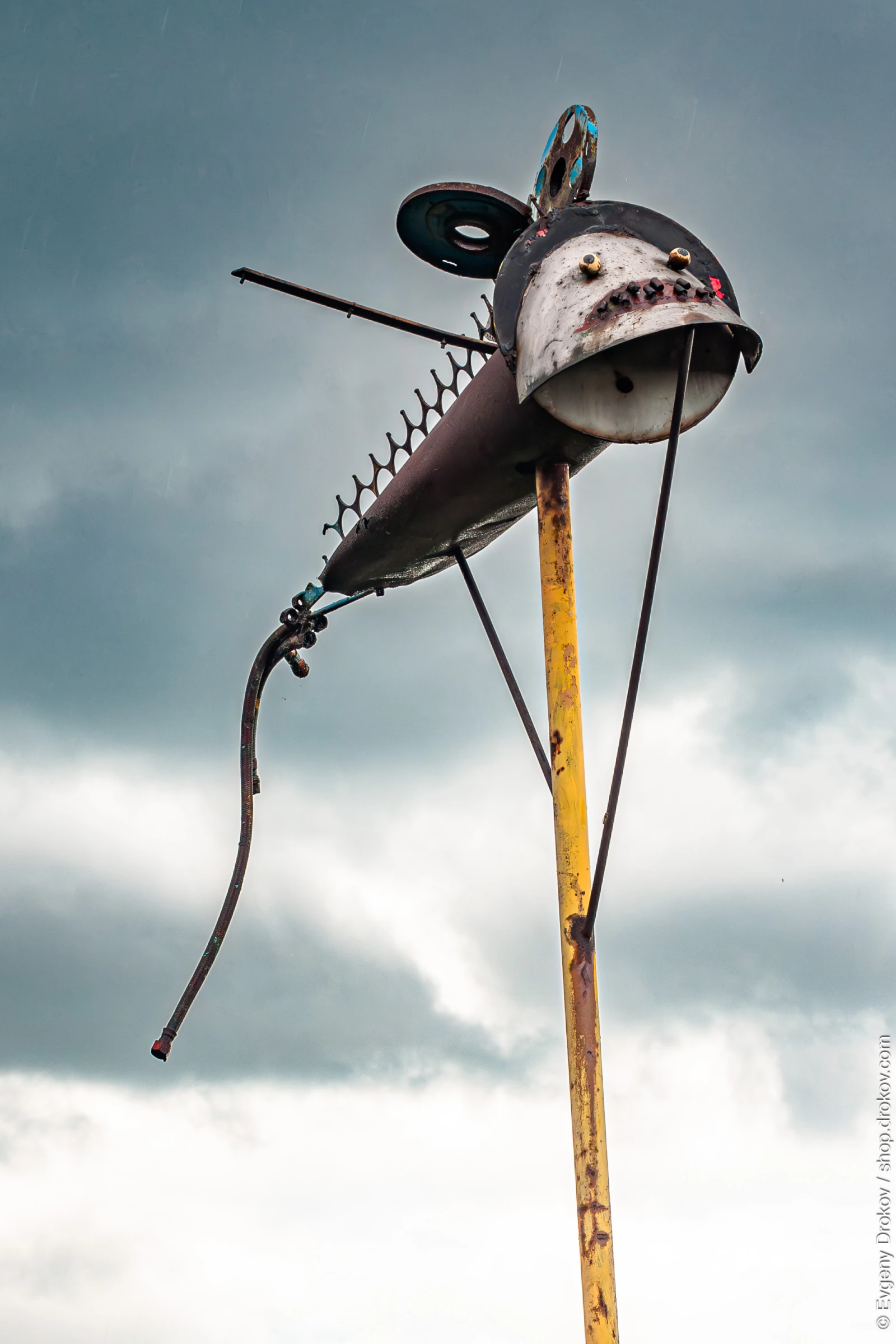 This striking metal sculpture, resembling a whimsical fish, stands proudly in Liege, Belgium. Its unique construction from repurposed materials transforms discarded items into a captivating work of art, adding character to the urban landscape.