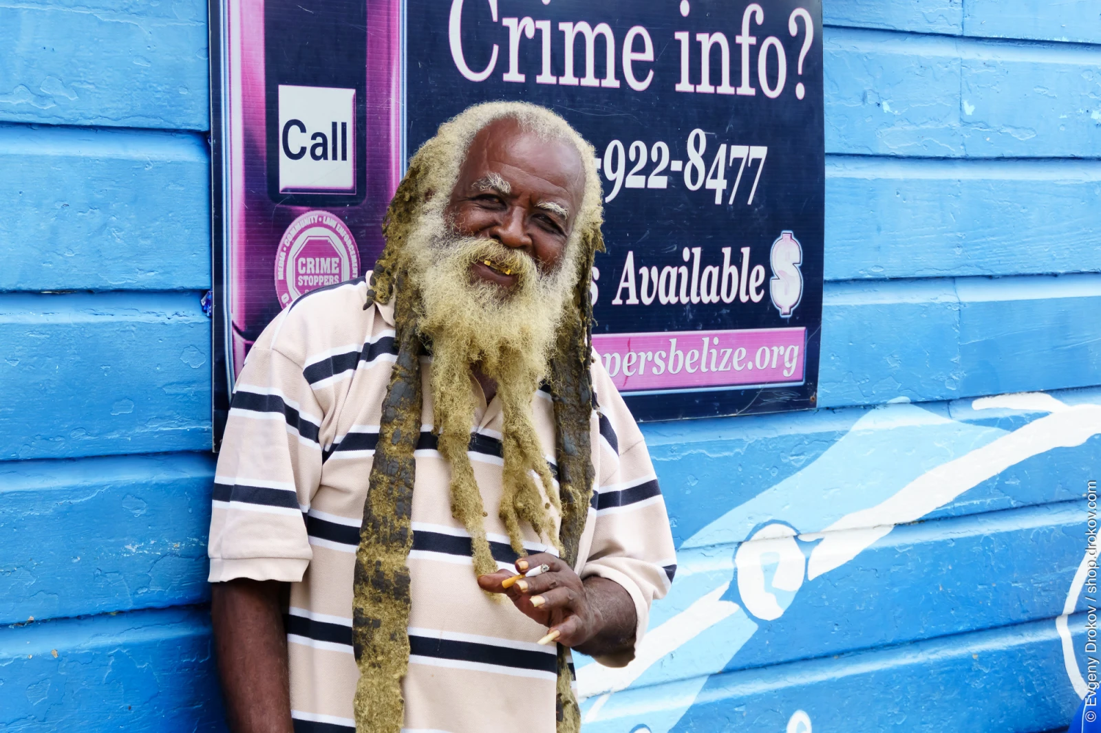 In Belize City, Belize, September 2015, a man with distinctive dreadlocks and a beard poses confidently. He holds a lit cigarette, his expression engaging. Behind him, a sign advertises "Crime info?" with a phone number and website, indicating a community initiative for reporting crime.