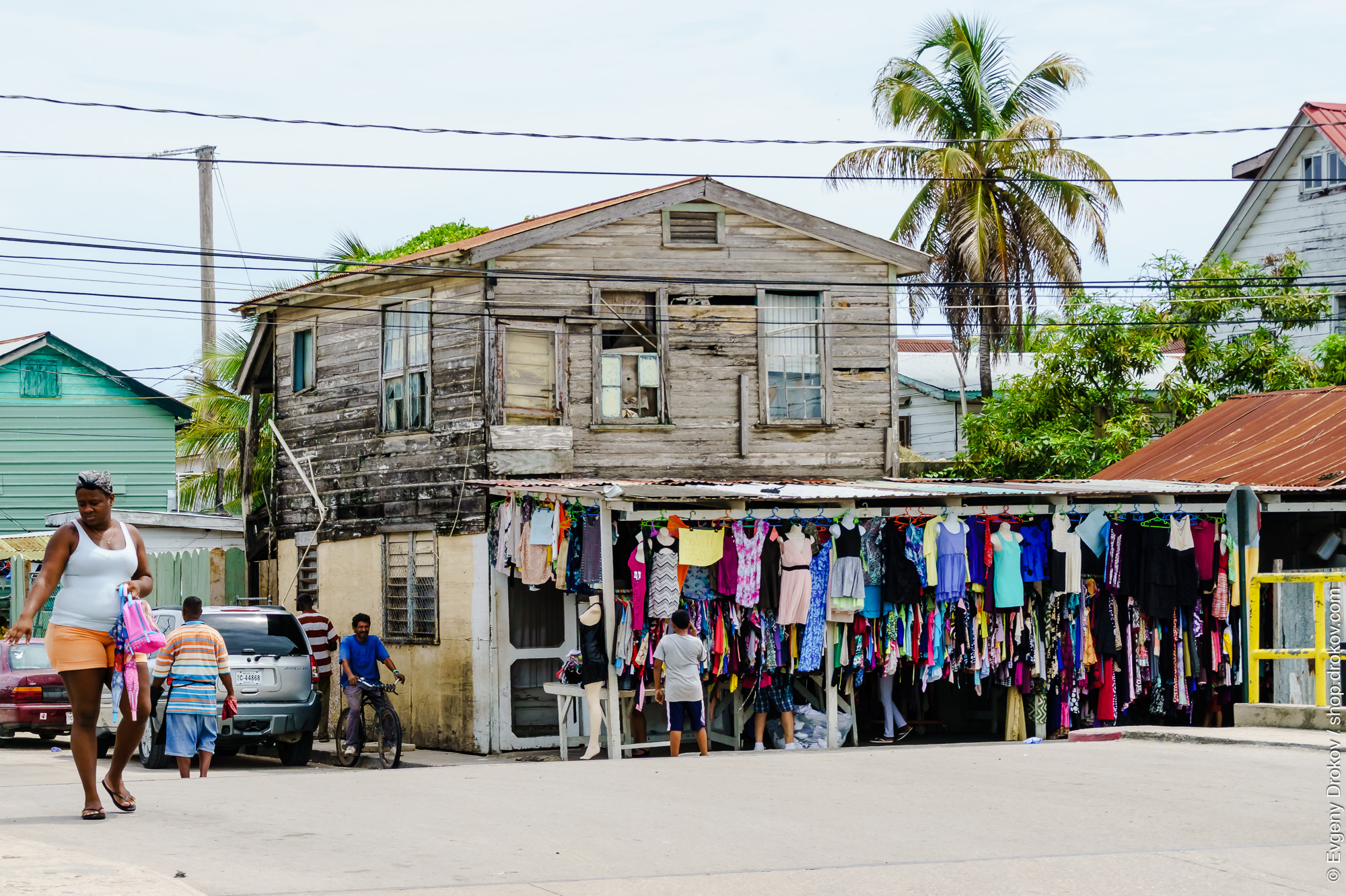 In Belize City, Belize, September 2015, locals browse a vibrant clothing stall set up outside a weathered wooden building. This captures the everyday commerce and street life of the district.