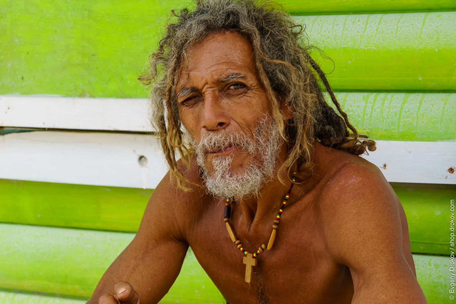 A weathered man with dreadlocks and a beard, adorned with a wooden cross necklace, is captured in a close-up portrait. The setting is Caye Caulker, Belize, in September 2015, with a vibrant green wooden structure serving as the backdrop. This portrait conveys a sense of resilience and the unique character of the island.