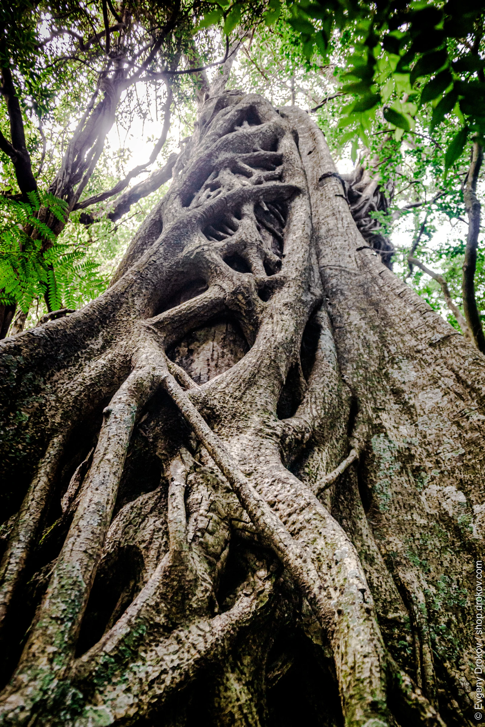 This striking composition captures the immense, gnarled roots of an ancient tree in Rincon de la Vieja, Costa Rica, in September 2015. The upward perspective emphasizes the tree's enduring strength and its deep connection to the earth, a testament to nature's raw power.