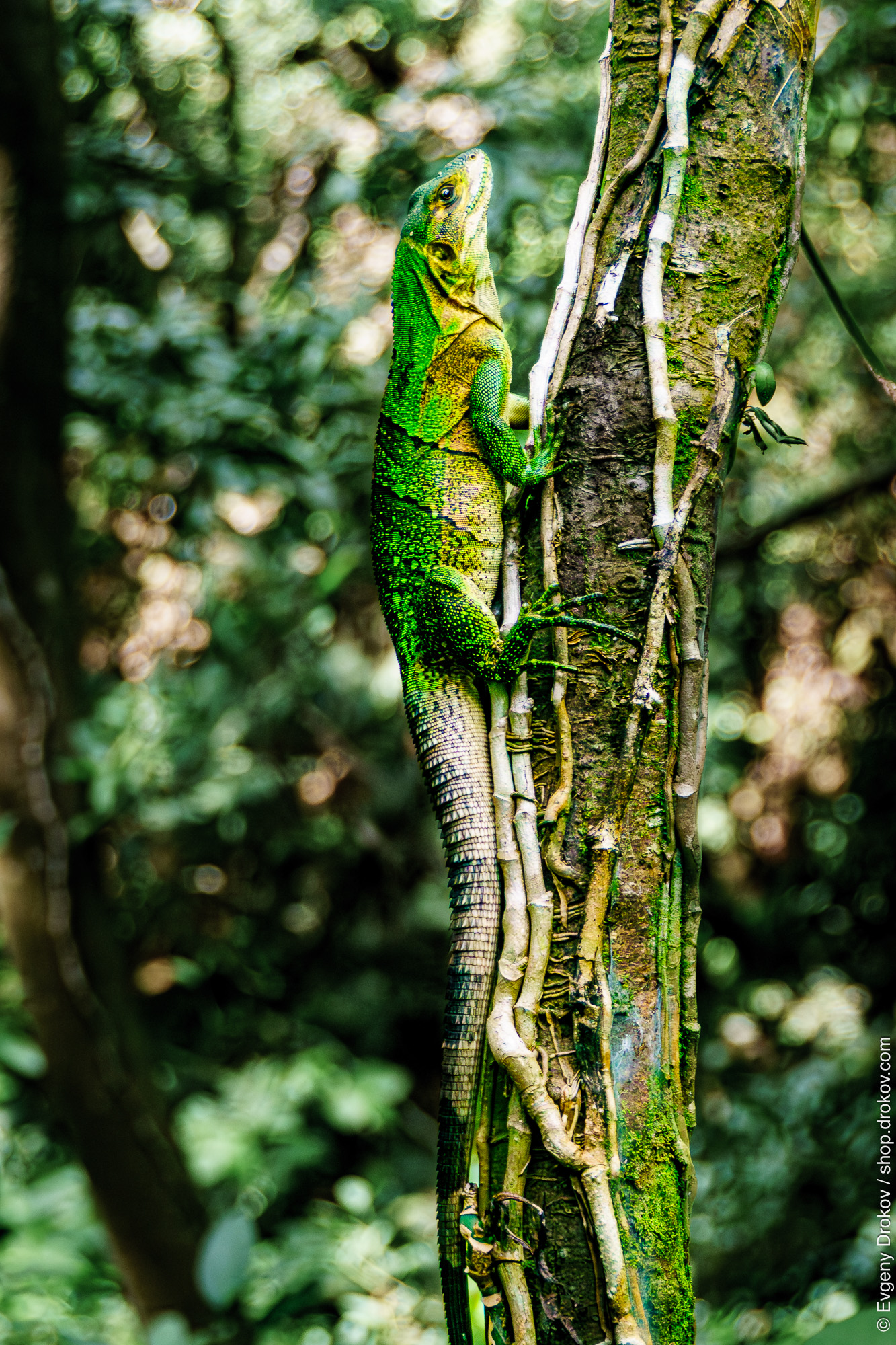 A vibrant green iguana clings to a moss-covered tree in Rincon de la Vieja, Costa Rica, in September 2015. This striking creature, a symbol of the region's rich biodiversity, is captured in its natural habitat, showcasing the lushness of the rainforest.