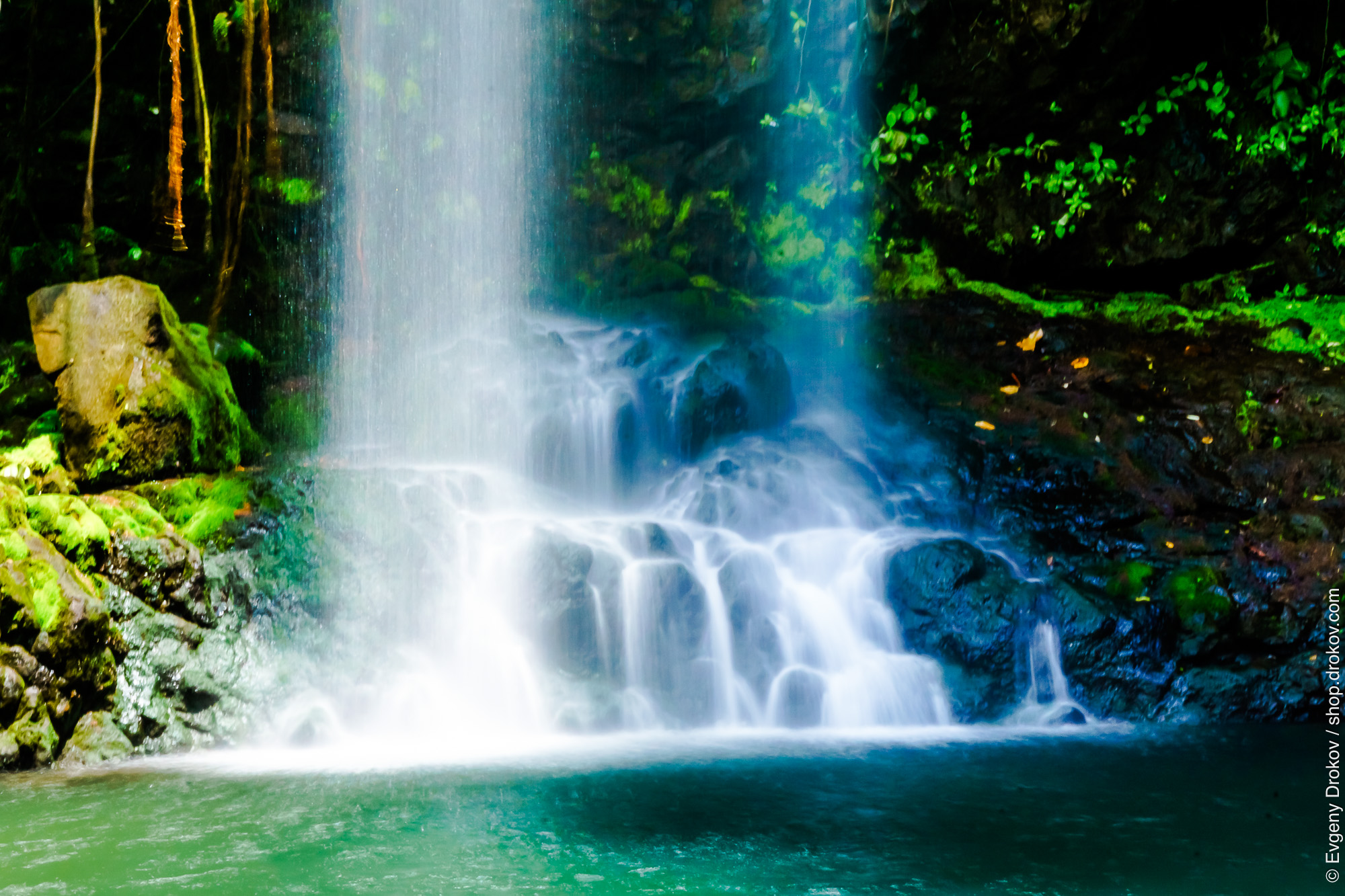 This is a long exposure capture of a waterfall in Rincon de la Vieja, Costa Rica, taken in September 2015. The technique renders the water as a silky, ethereal flow, highlighting the lush, verdant surroundings and the raw power of nature.