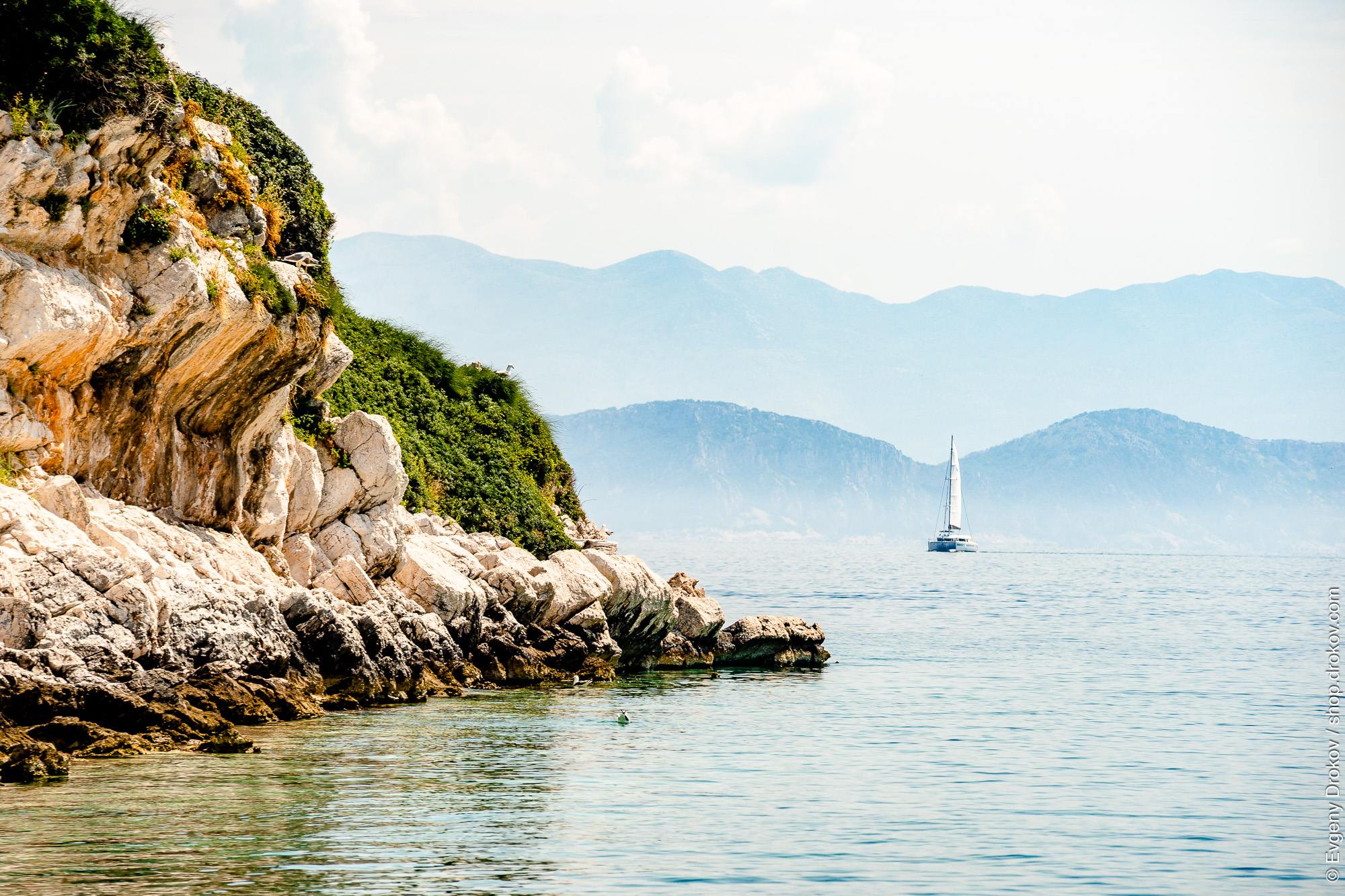 A sailboat navigates the clear waters of the Adriatic Sea near Dubrovnik, Croatia. The vessel's journey is set against a backdrop of rugged, vegetation-covered cliffs and distant, hazy mountains, showcasing the serene beauty of this coastal paradise on a bright, sunny day.