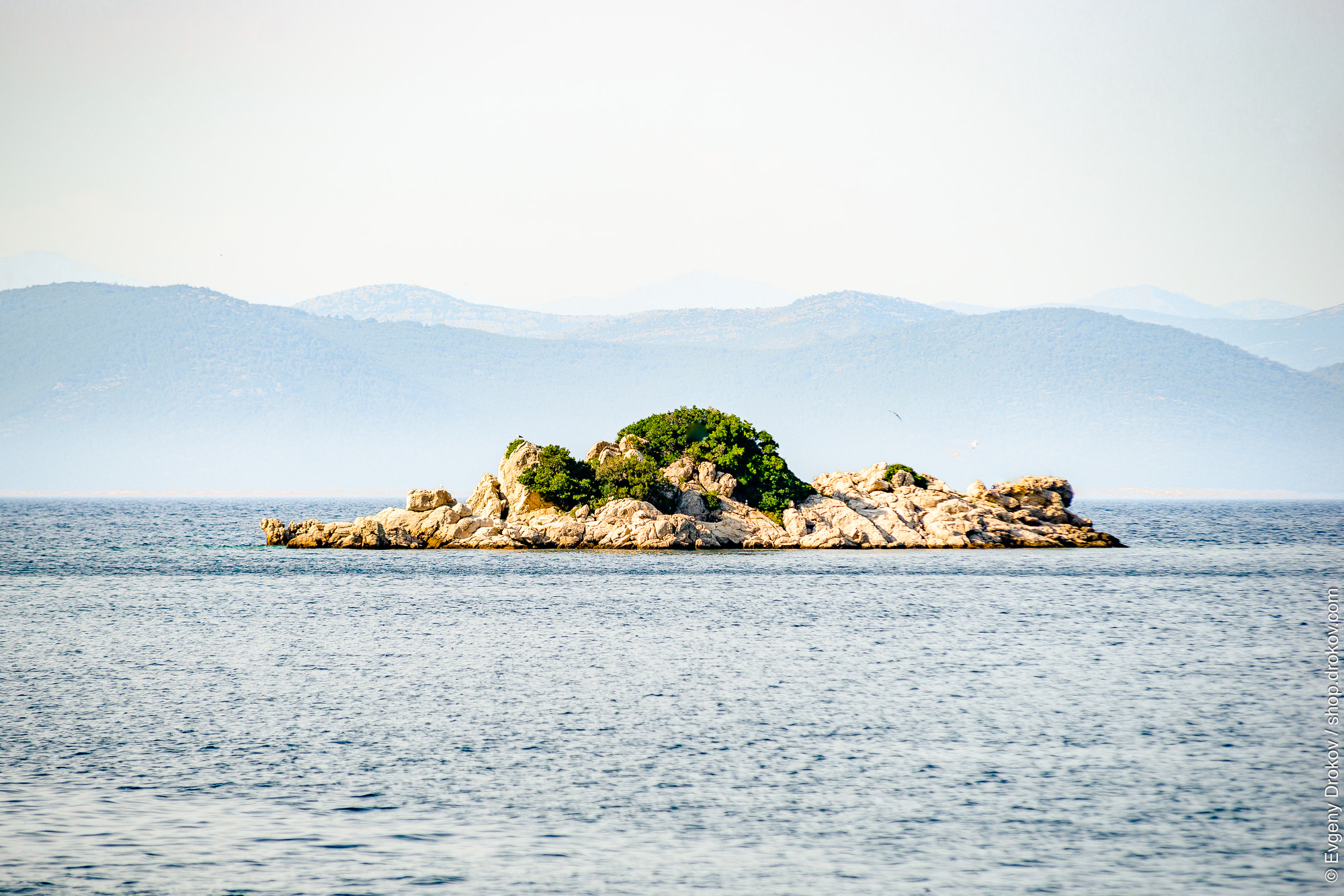A solitary island, a rugged outcrop of light-colored rock and vibrant vegetation, rests serenely in the Adriatic Sea. Distant, hazy mountains form a majestic backdrop to this tranquil Croatian coastal vista, captured near Dubrovnik.