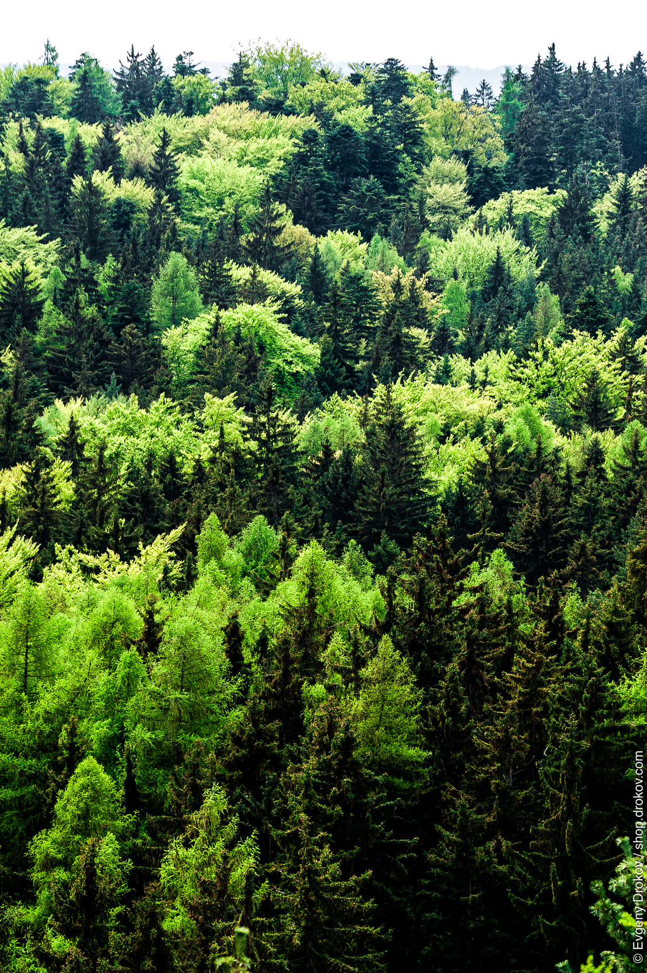 A vibrant forest in Karlovy Vary, Czech Republic, bursts with new life in April. The lush canopy showcases a rich tapestry of greens, from the deep hues of evergreen conifers to the bright, fresh foliage of deciduous trees. This captures the essence of spring's awakening in a picturesque European landscape.