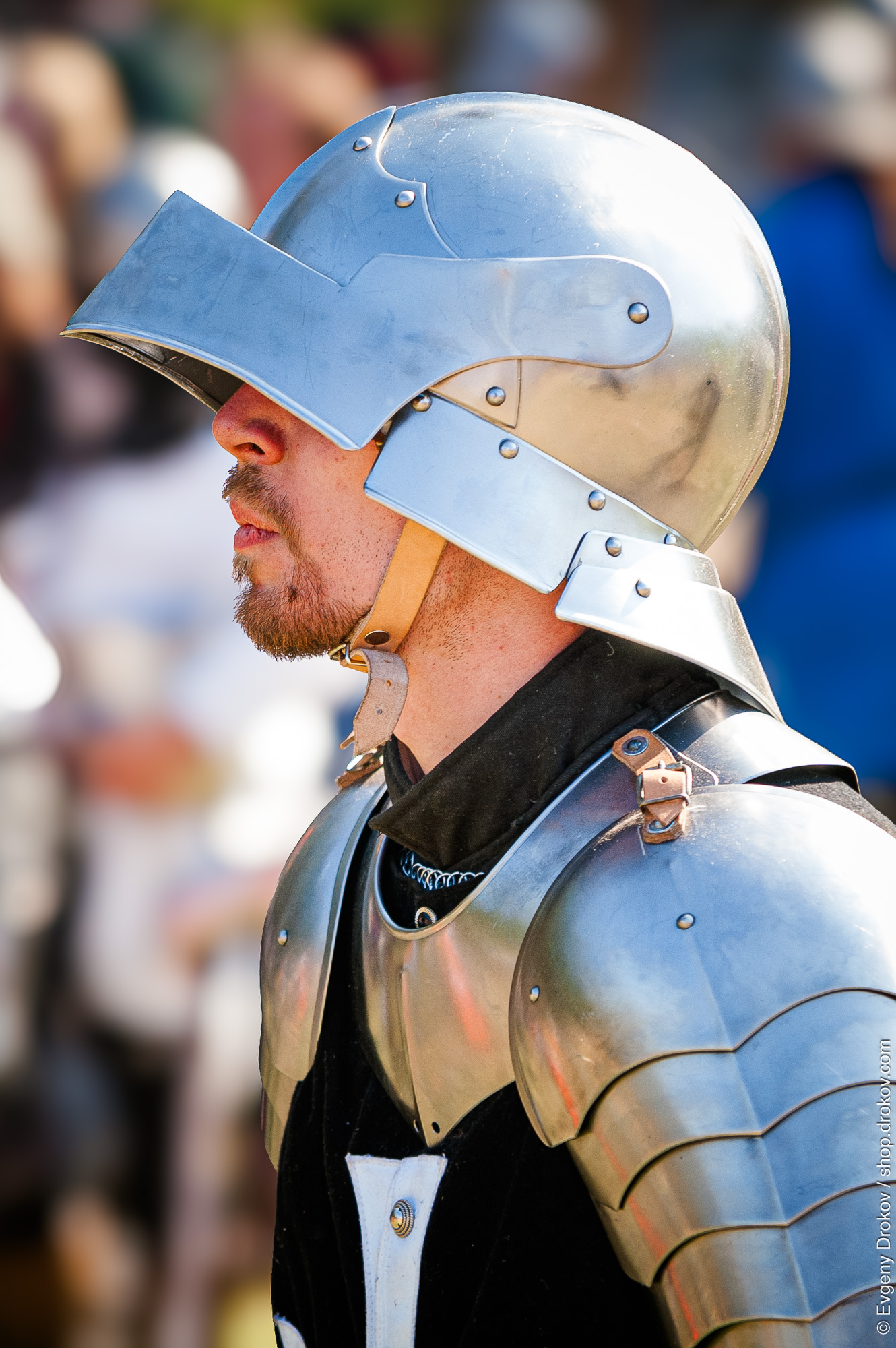 A participant in a fantasy battle reconstruction at Libušín, Czech Republic, dons authentic medieval armor. This event recreates historical combat for entertainment and education.