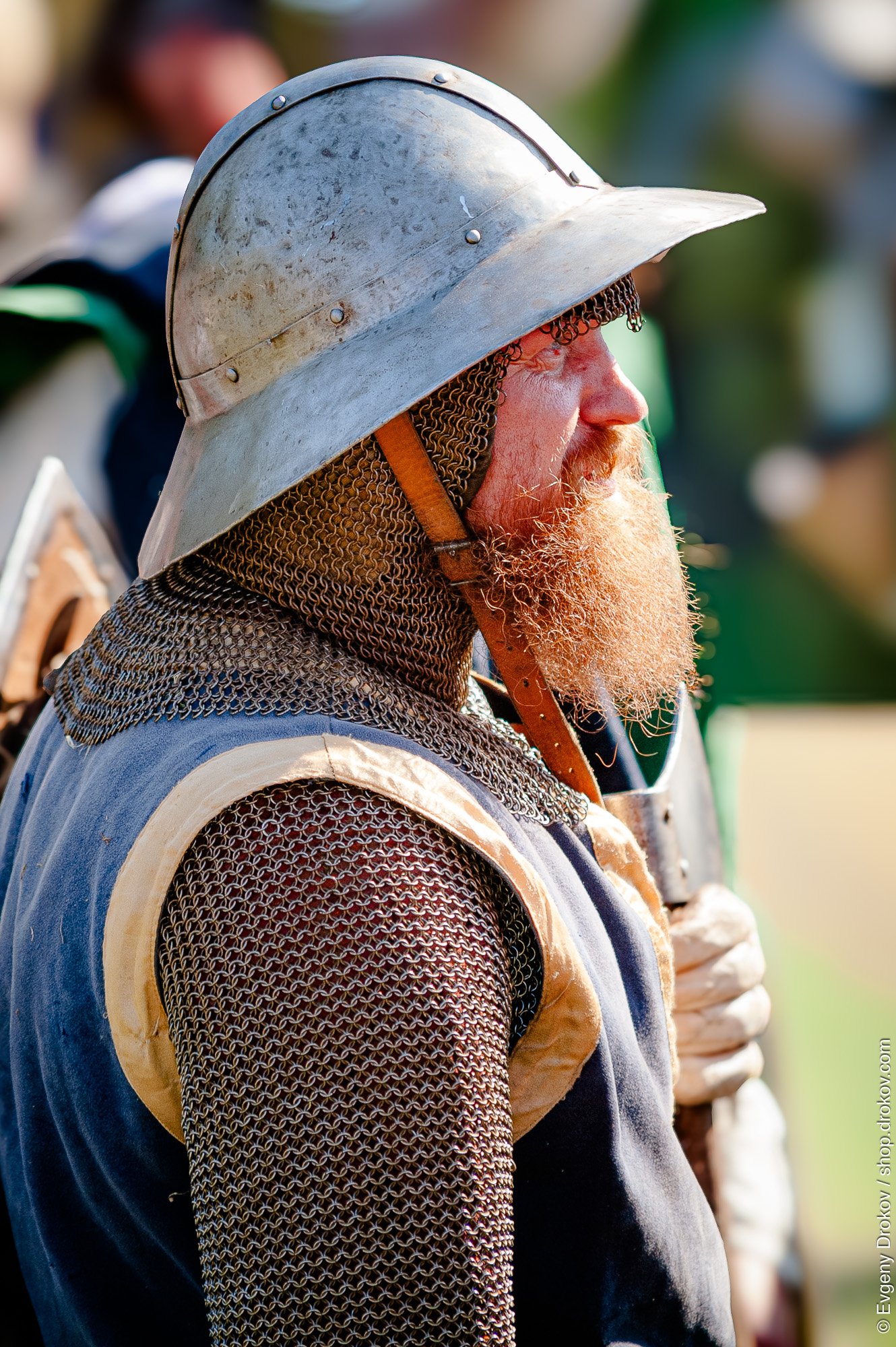 A warrior, clad in authentic chainmail and helmet, participates in a historical battle reconstruction at Libušín, Czech Republic. This event recreates past conflicts, offering a vivid glimpse into medieval warfare.