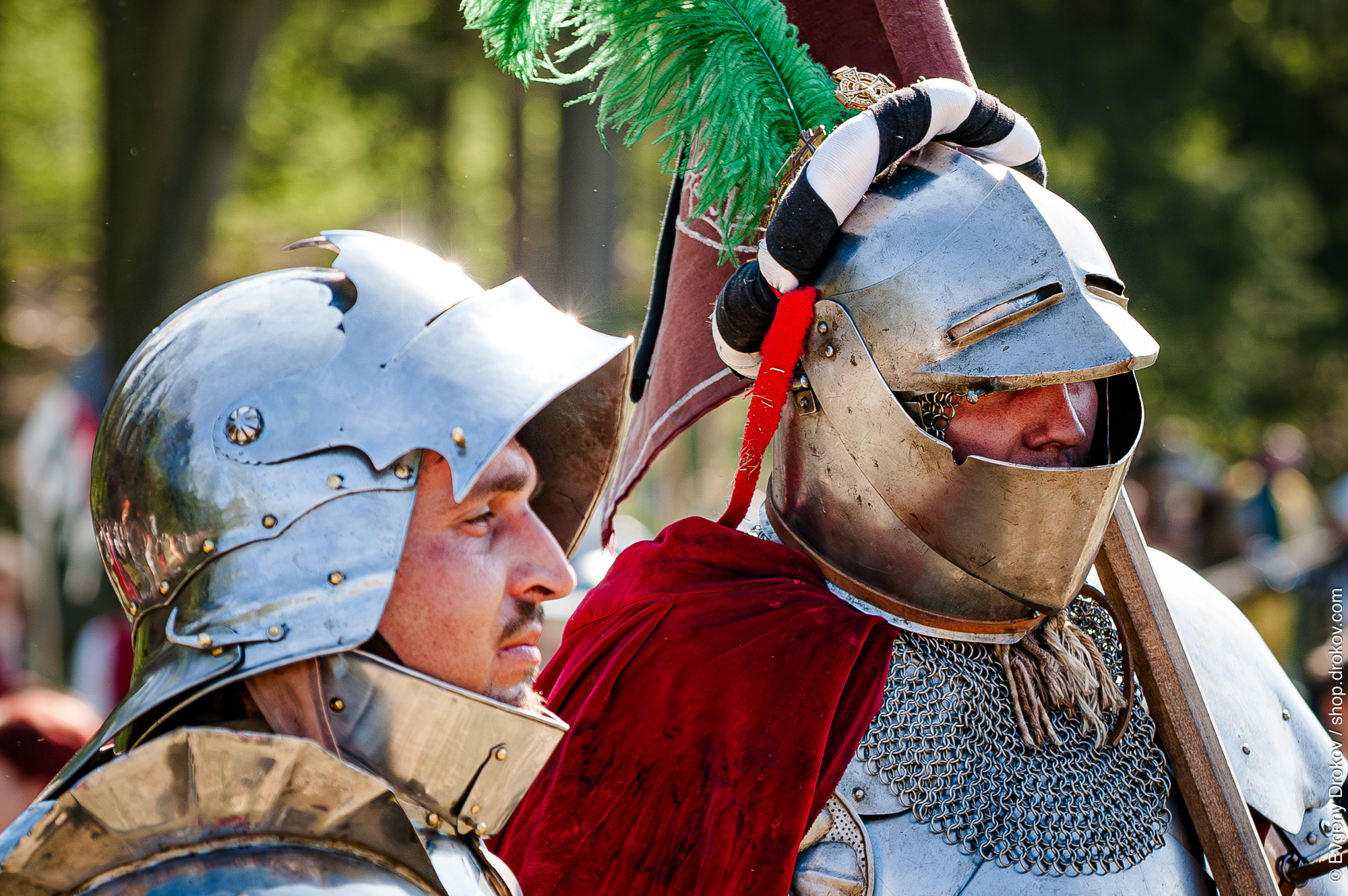 Two knights in full armor prepare for a fantasy battle reconstruction at Libušín, Czech Republic. This event recreates historical combat for an audience.