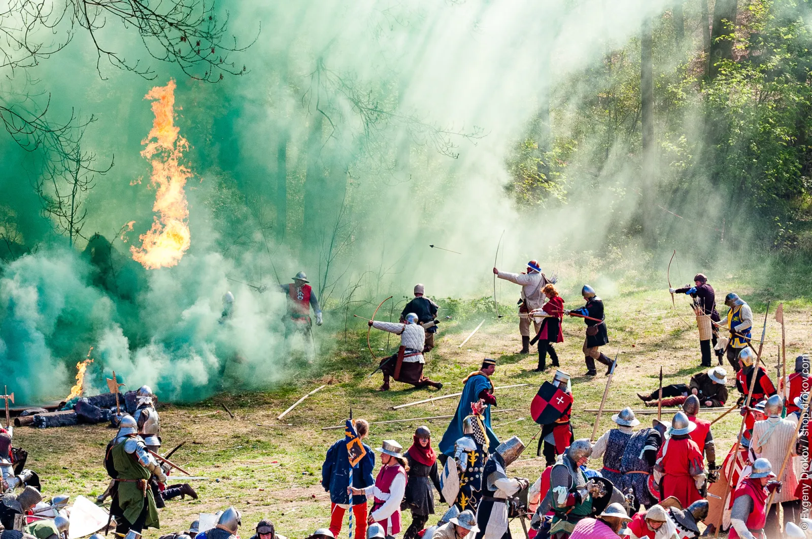 Warriors engage in a fierce fantasy battle reconstruction at Libušín, Czech Republic. Flames erupt amidst green smoke, symbolizing the chaos and intensity of combat. This event recreates historical battles for entertainment and education.