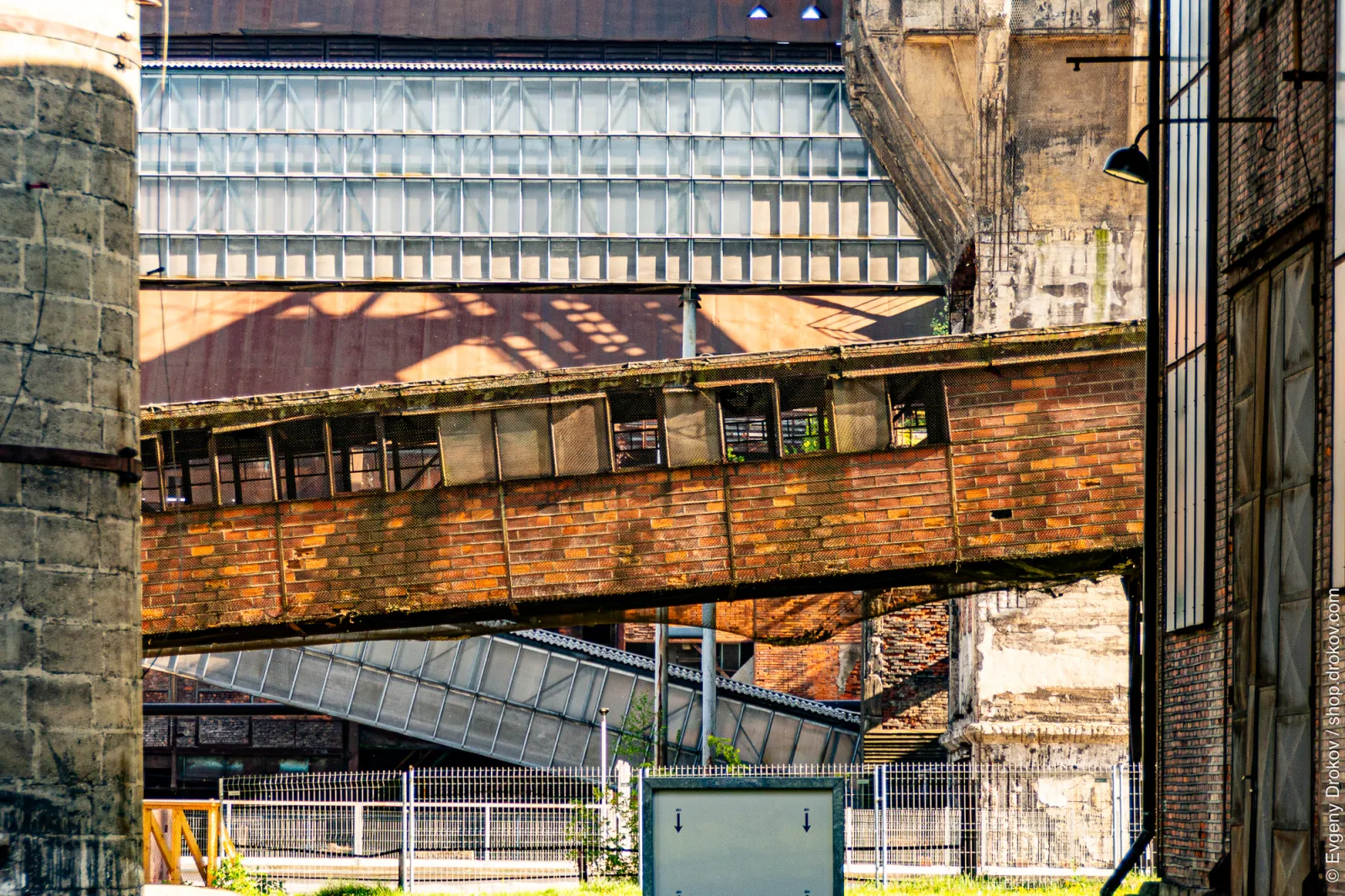 Industrial architecture. A rusty, brick walkway spans between decaying factory buildings. The sun casts long shadows, highlighting the age and history of the structures.