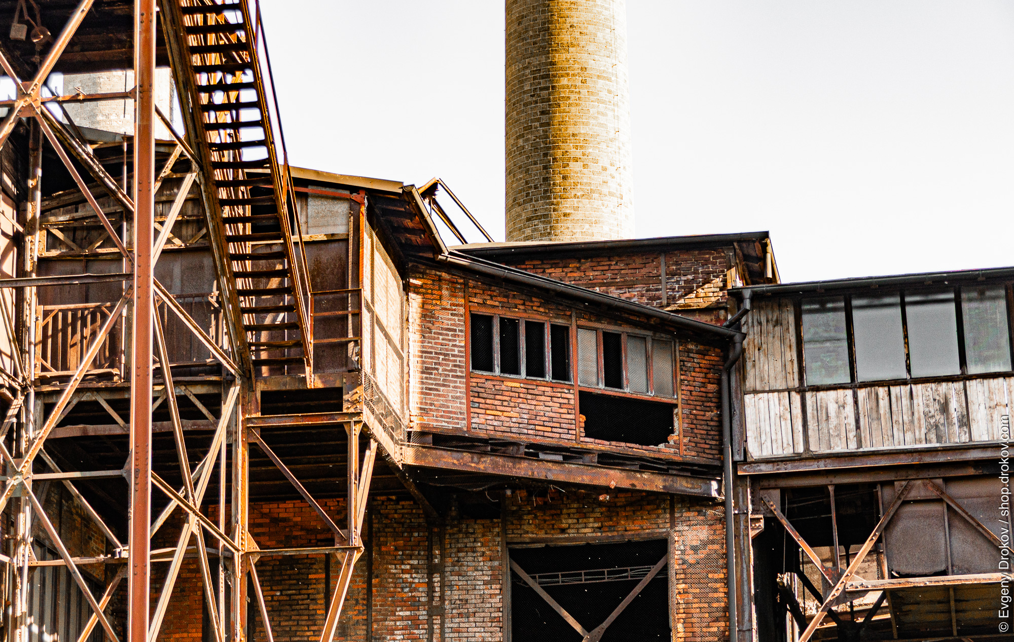 A dilapidated industrial complex, showcasing rusted metal supports and aged brickwork. The structure's age and neglect are evident in the broken windows and weathered materials. The tall brick chimney stands as a testament to the building's former industrial purpose.