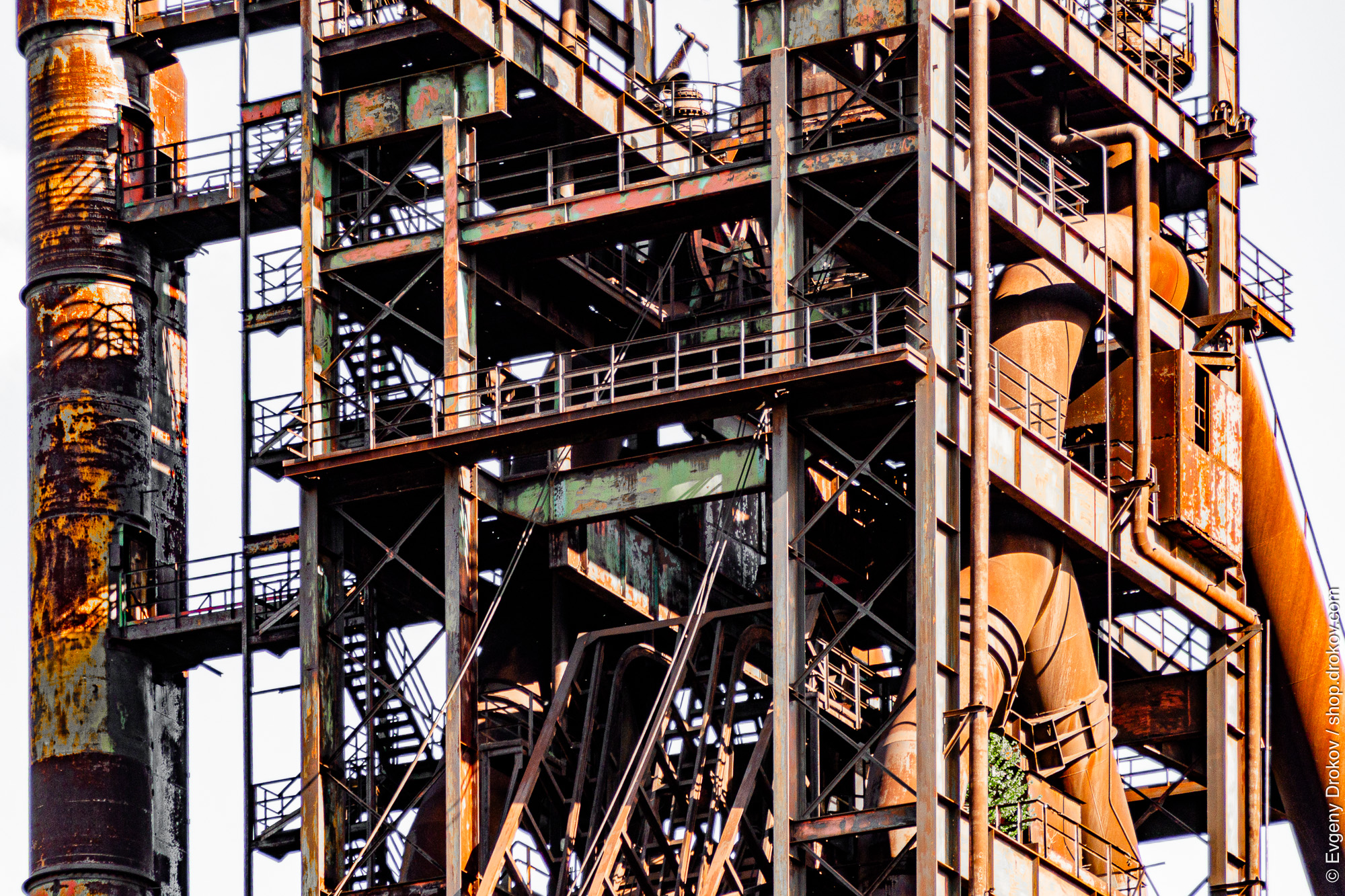 This is a close-up of a section of an industrial steel structure. The rusty metal beams, pipes, and walkways are clearly visible. This structure is part of a former steel mill, showcasing the intricate and robust engineering of industrial facilities.