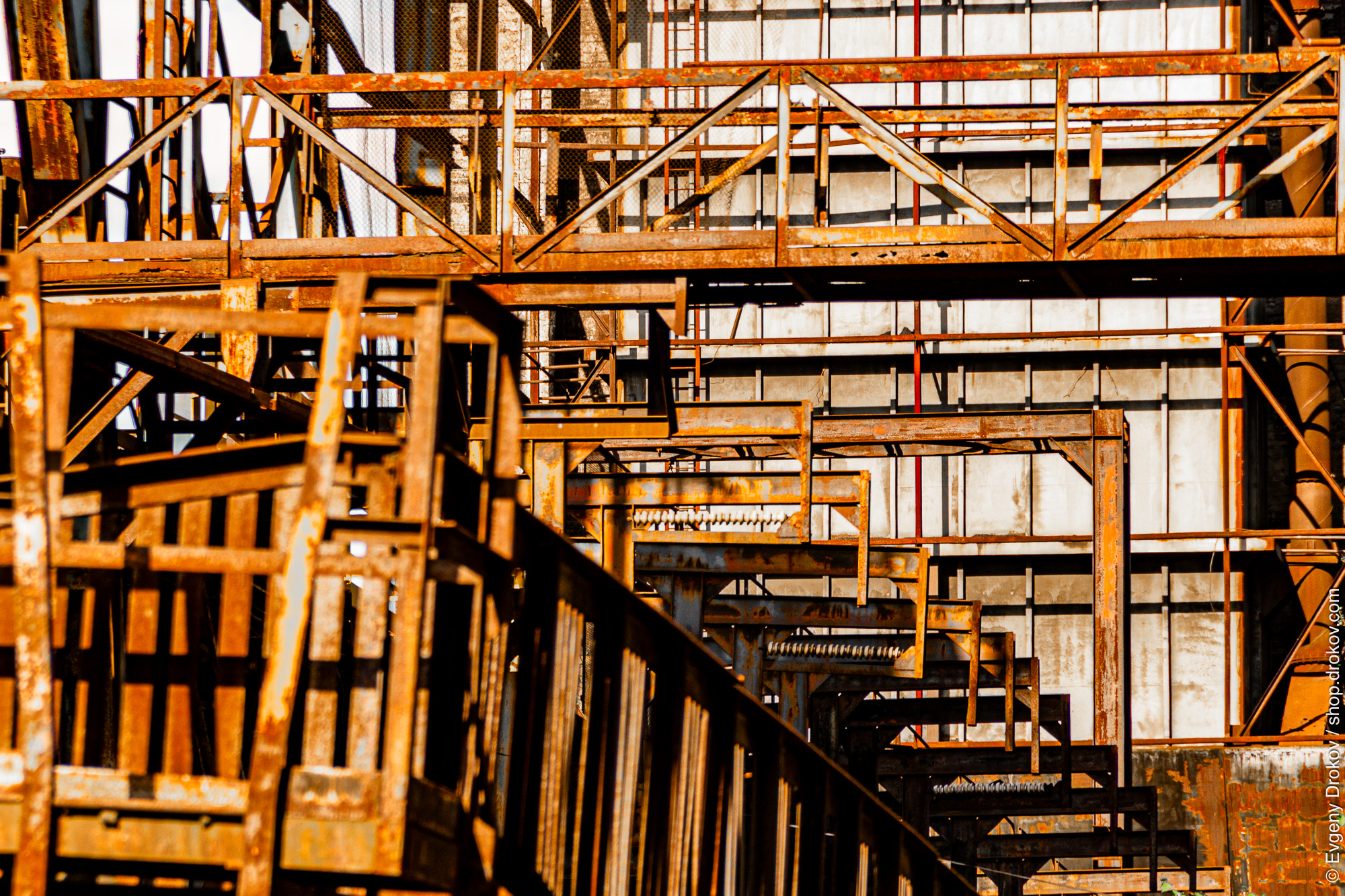Rusty metal beams and supports crisscross an industrial structure. The aged metalwork, with visible signs of corrosion, forms a complex network of scaffolding and support systems. This image showcases the intricate design and construction of a large-scale industrial building.
